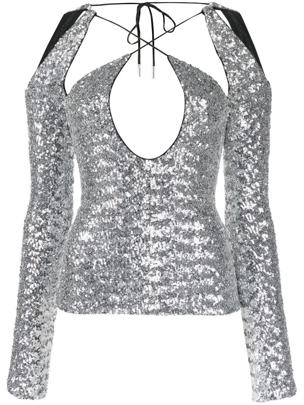Zane sequinned cut-out top Made in Italy and covered in glistening sequins, the Zane top speaks to The Attico's penchant for bold silhouettes and textures. Boasting a revealing scoop neck and exposed shoulders, the design ties in at the rear. Highlights - Silver-tone - Sequin embellishment - Scoop neck - Cut-out detailing - Rear tie fastening - Long sleeves - Open back - Straight hem Made in Italy Composition Lining: Polyamide 82%, Spandex/Elastane 18% Outer: Polyester 100% SIZE & FIT Model measurements Height 5 ft 10 in(1.78 m) Bust/Chest 30.7 in(78 cm) Hips 34.64 in(88 cm) Waist 23.22 in(59 cm) FittingInformation Designed for a close fit throughout The tie fastening gives an adaptable and personalised fit This piece fits true to size – take your usual size