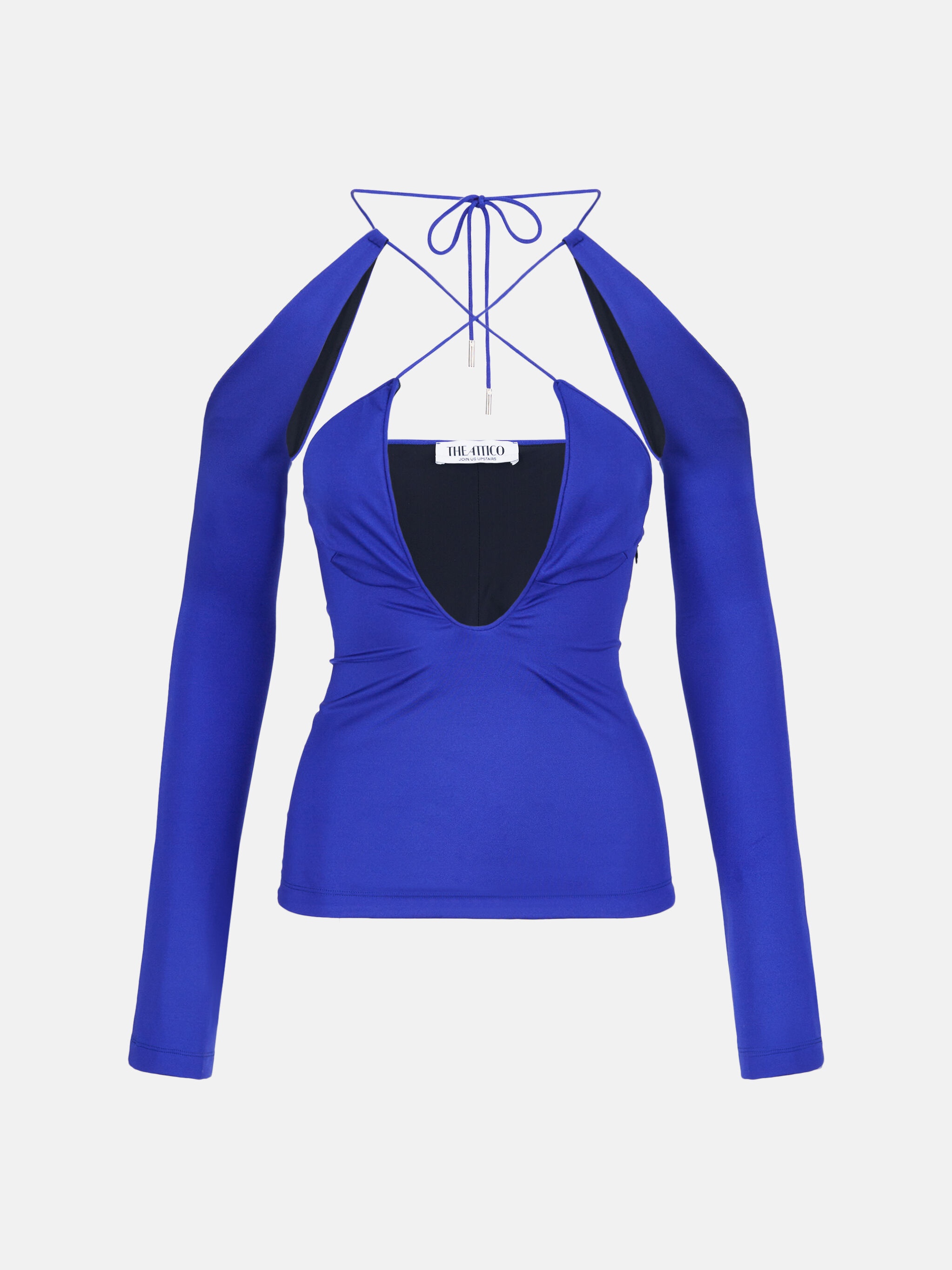 ''Zane'' top in vivid violet shiny lycra with long sleeves, deep and crossed neckline and cylindrical logo metal ends. Style 236WCT206PA44493 SIZE & FIT Regular fit. We recommend taking your true size. DETAILS Main fabric: 80% polyester 20% elastane, lining: 84% nylon 16% elastane