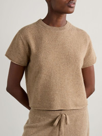The Elder Statesman uses sumptuous cashmere dyed in a range of colors for its mood-boosting knitwear. This sweater has a boxy fit and short sleeves. The classic camel shade is endlessly versatile. Size & Fit - Fits true to size, take your normal size - Intended for a boxy fit, cut to be worn loose - Cropped length - Lightweight knit - Model is wearing a size Small Details & Care - Camel cashmere - Slips on - 100% cashmere - Dry clean