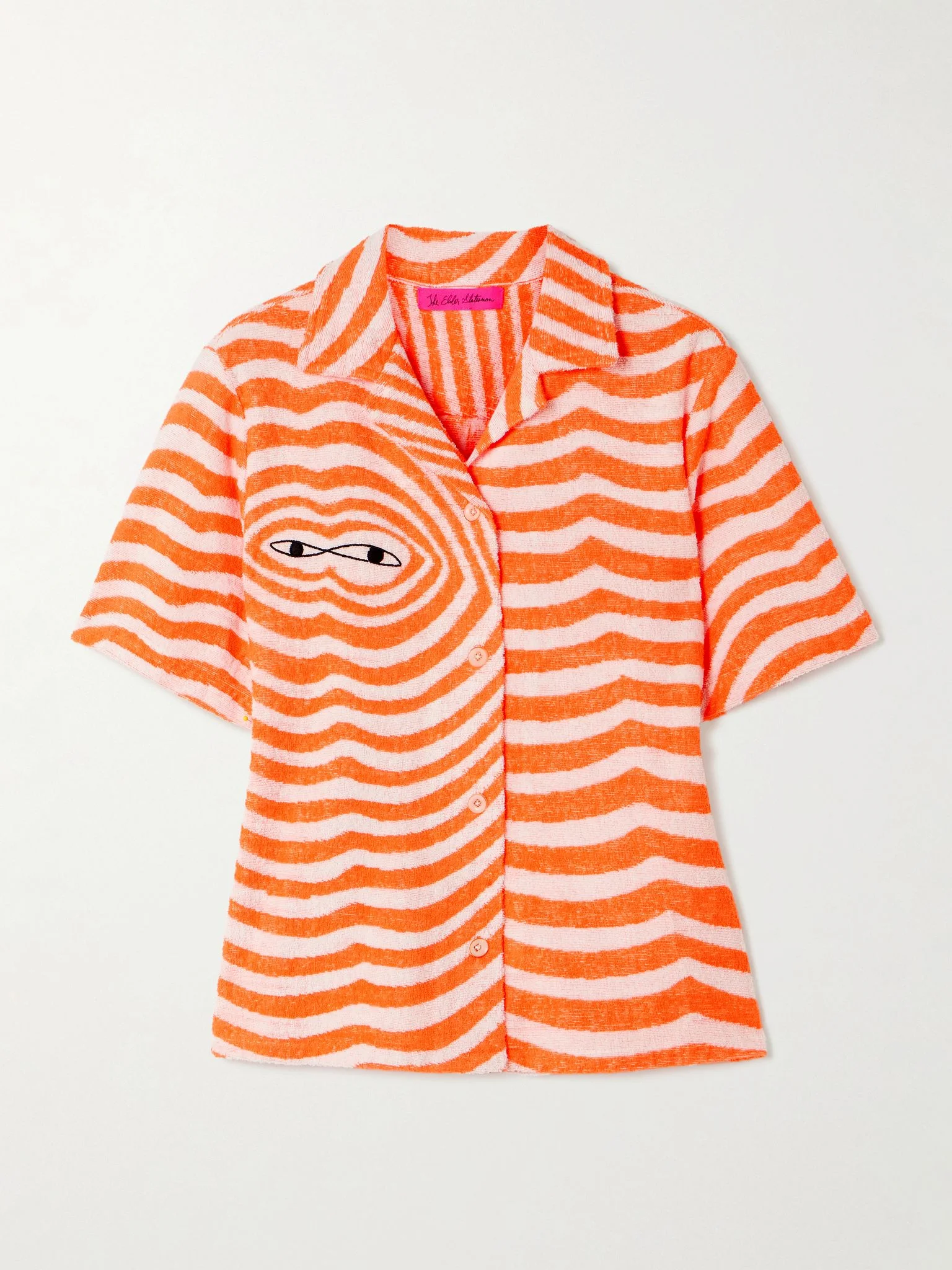 EXCLUSIVE AT NET-A-PORTER. Vibrant colors and playful details make The Elder Statesman's pieces such a joy to wear. Made from soft cotton-terry, this shirt is patterned with orange stripes and embroidered with peeking eyes at the chest. Wear yours as a set with the matching shorts. Size & Fit - Fits true to size, take your normal size - Designed for a slim fit - Mid-weight, slightly stretchy fabric - Model is 177cm/ 5'10" and is wearing a size Small Model measurements: - Bust: 77cm/ 30.5" - Waist: 62cm/ 24.5" - Hip: 88cm/ 34.5" Details & Care - Orange and peach cotton-terry - Button fastenings through front - 100% cotton - Designer color: Tangerine