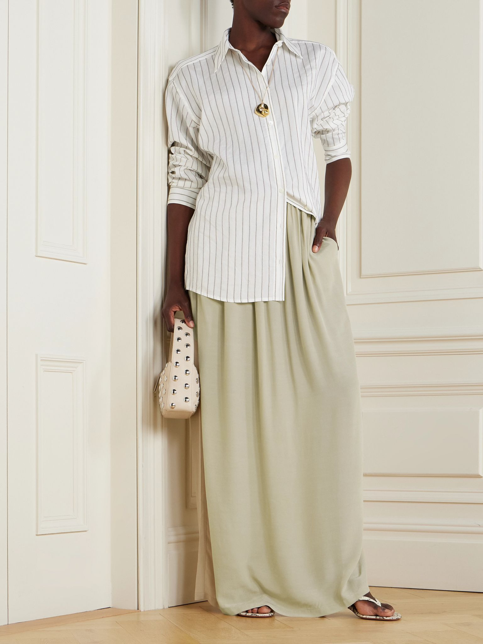 The Frankie Shop's 'Aeson' skirt is not only effortless to style, but also timeless and comfortable. It's made from versatile sage-green jersey and has an elasticated, gathered waist that enhances the floaty shape. Size & Fit - Fits true to size, take your normal size - Ankle length , designed to be worn at the waist - Elasticated at the waist for a flexible fit - Lightweight, stretchy fabric - Model is 177cm/ 5'10" and is wearing a size Small Model measurements: - Bust: 80cm/ 31.5" - Waist: 60cm/ 23.5" - Hip: 89cm/ 35" Details & Care - Sage-green jersey - Slips on - 100% viscose