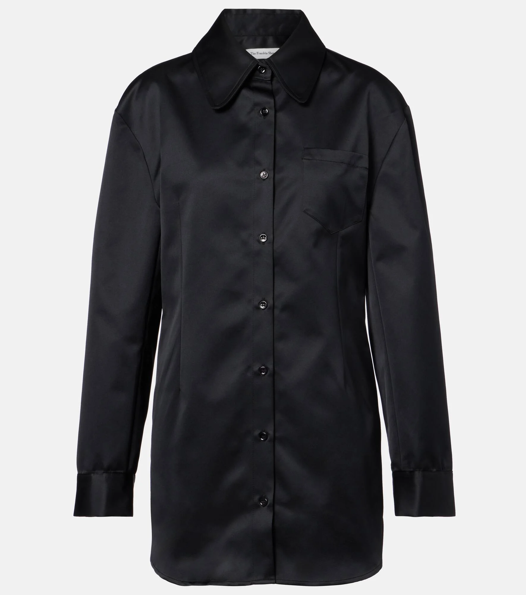 The Frankie Shop has captured the hearts of fashion insiders with their low-effort, high-impact essentials. The Akita shirt dress is made from lustrous satin with a cinched waist and a pointed collar. Product Details - Material: 100% polyester - Care instructions: hand wash - Made in Portugal - Color: black - Designer color name: Black - Closure: buttoned front - Pockets: breast pocket - Item number: P01132037 Size & Fit - True to size - Cinched waist - Non-stretchy fabric - The model seen in the picture is 178cm-5'10" and wearing a size XS