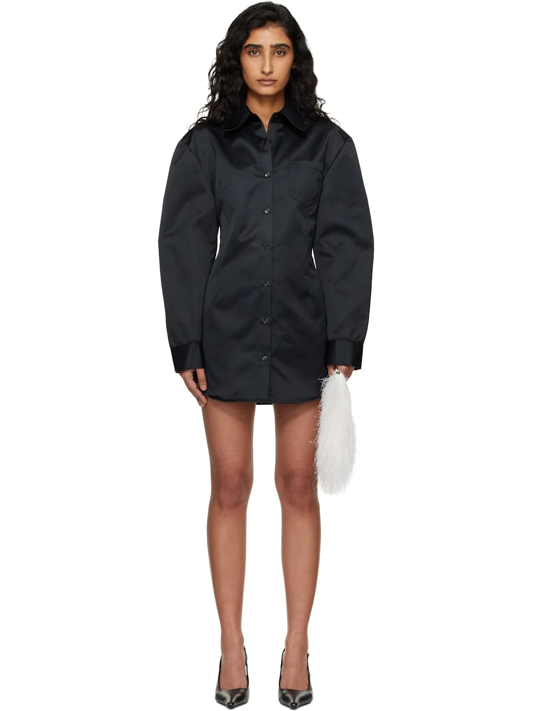 Satin minidress. · Spread collar · Button closure · Patch pocket at chest · Darts at bodice · Seam pockets at waist · Shirttail hem · Dropped shoulders · Single-button barrel cuffs Supplier color: Black 100% polyester. Made in Portugal 261115F052000