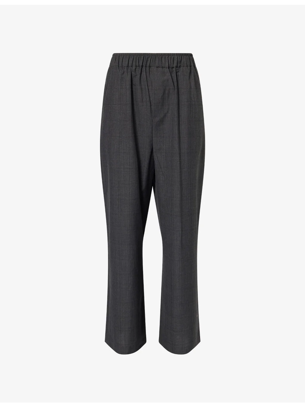 PRODUCT DETAILS - The Frankie Shop woven trousers - 55% polyester, 45% wool - Regular fit, high-rise, wide leg, elasticated waistband, side slip pockets, all-over plaid pattern - Dry clean - True to size - Size small: rise 15.5in / 39cm, inside leg 30in / 76cm, leg opening 23in / 58.5cm - Model is 5ft 10in/1.78m and wears a size small - Midweight, non-stretch Ref: R04546947