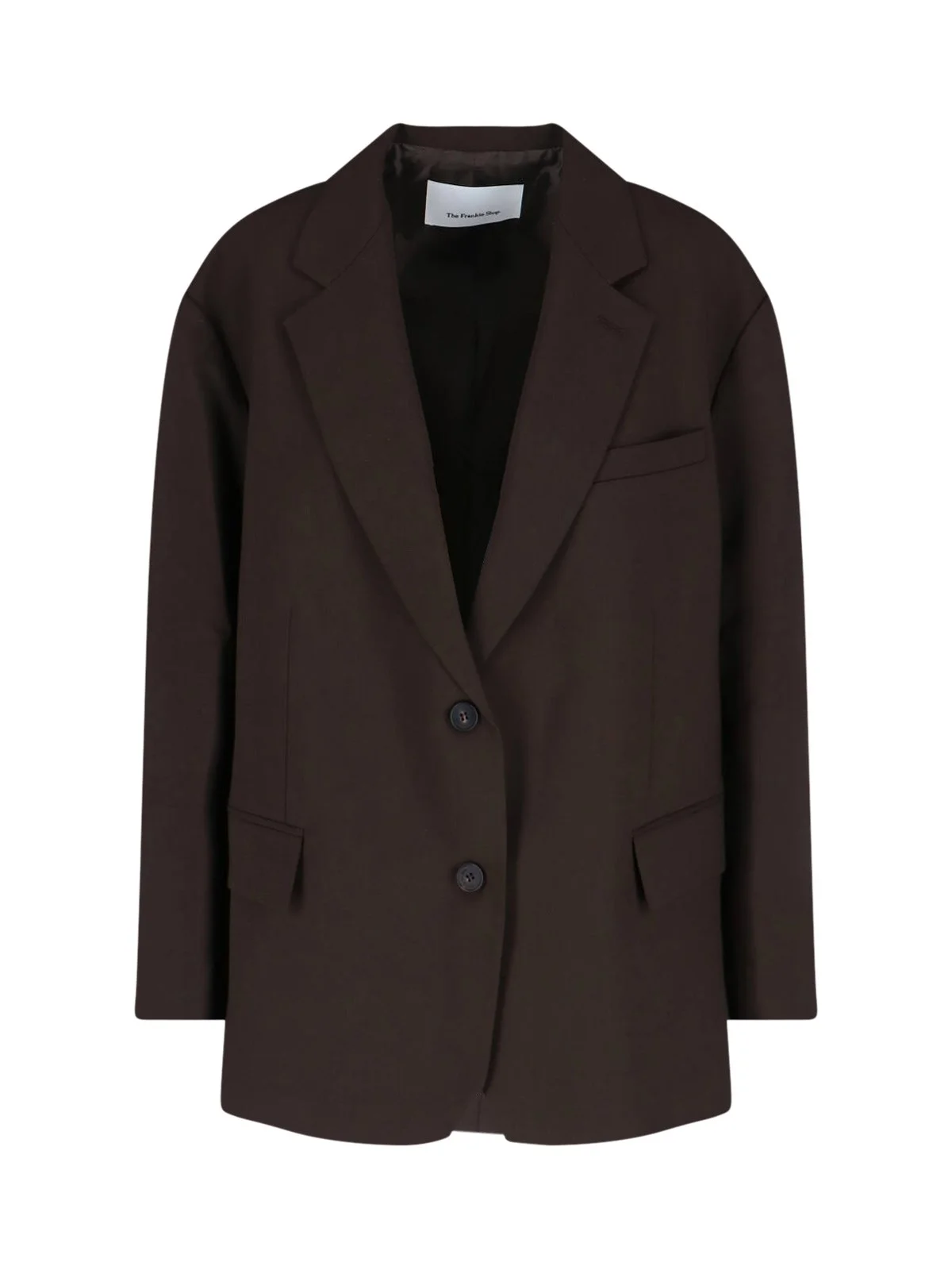 THE FRANKIE SHOP 'BEA' BLAZER IN BROWN STRETCH FABRIC WITH CLASSIC LAPELS, V-NECK, SINGLE-BREASTED BUTTON CLOSURE ON THE FRONT, LONG SLEEVES, TWO FRONT FLAP POCKETS, WELT POCKET ON THE CHEST, STRAIGHT HEM. PRODUCT INFO PRODUCT CODE BEA BLAZERDARK EXPRESSO COMPOSITION: 96% POLYESTER, 4% SPANDEX SIZE AND FIT: REGULAR FIT MADE IN: SOUTH KOREA