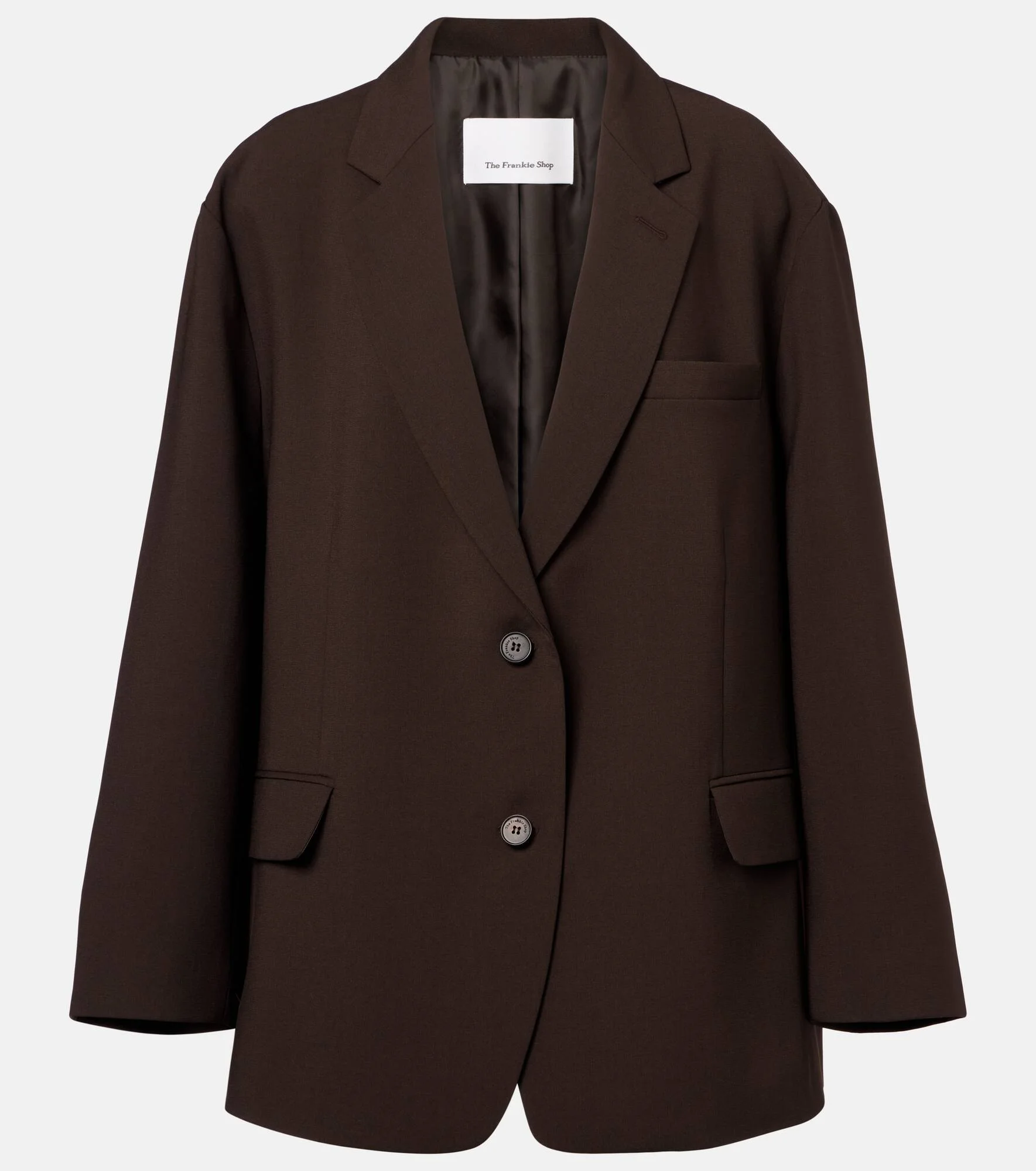 Highlighting the brand's dedication to tailored staples, the Bea blazer from The Frankie Shop is made from a mid-weight suiting fabric. Its oversized style is complemented by peak lapels and flap pockets for an effortlessly chic silhouette. Product Details - Material: 96% polyester, 4% elastane - Care instructions: dry clean - Made in Korea - Designer color name: Dark Espresso - Item color: brown - Lining: 100% polyester - Closure: buttoned front - Pockets: flap pockets - Buttoned cuffs - Item number: P01029168 Size & Fit - Fits large to size - we recommend trying one size smaller - Dropped shoulders - Oversized - Non-stretchy fabric - Falls below the hip - The model seen in the picture is 178cm-5'10" and wearing a size XXS