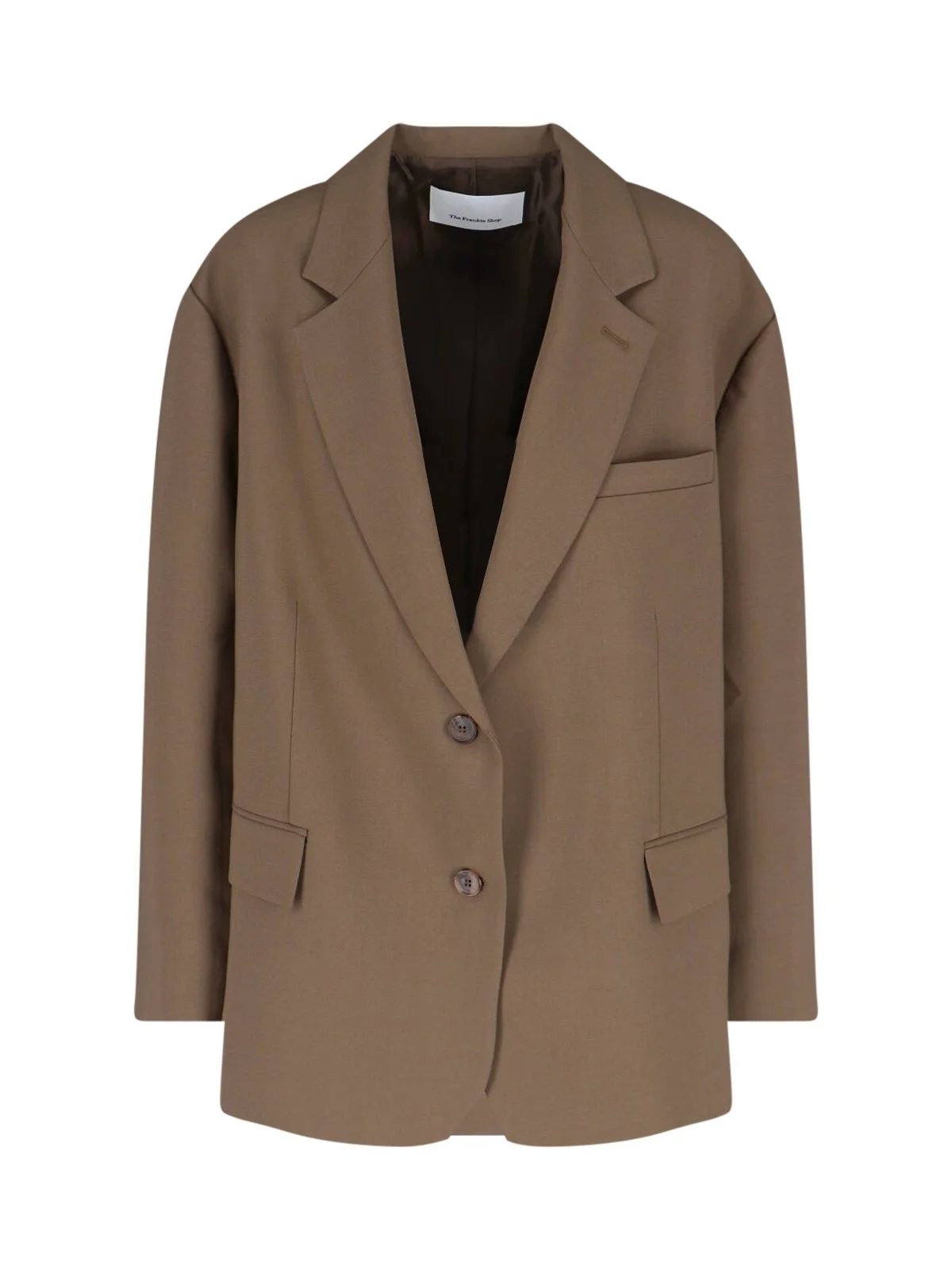THE FRANKIE SHOP 'BEA' SINGLE-BREASTED BLAZER IN LIGHT BROWN FABRIC WITH CLASSIC LAPELS, TWO-BUTTON CLOSURE, CHEST POCKET, TWO SIDE FLAP POCKETS, BUTTON CUFFS, TWO BACK SLITS, STRAIGHT HEM. PRODUCT INFO PRODUCT CODE BEA BLAZERCHOCOLATE COMPOSITION: 96% POLYESTER, 4% ELASTANE SIZE AND FIT: OVERSIZED FIT MADE IN: KOREA