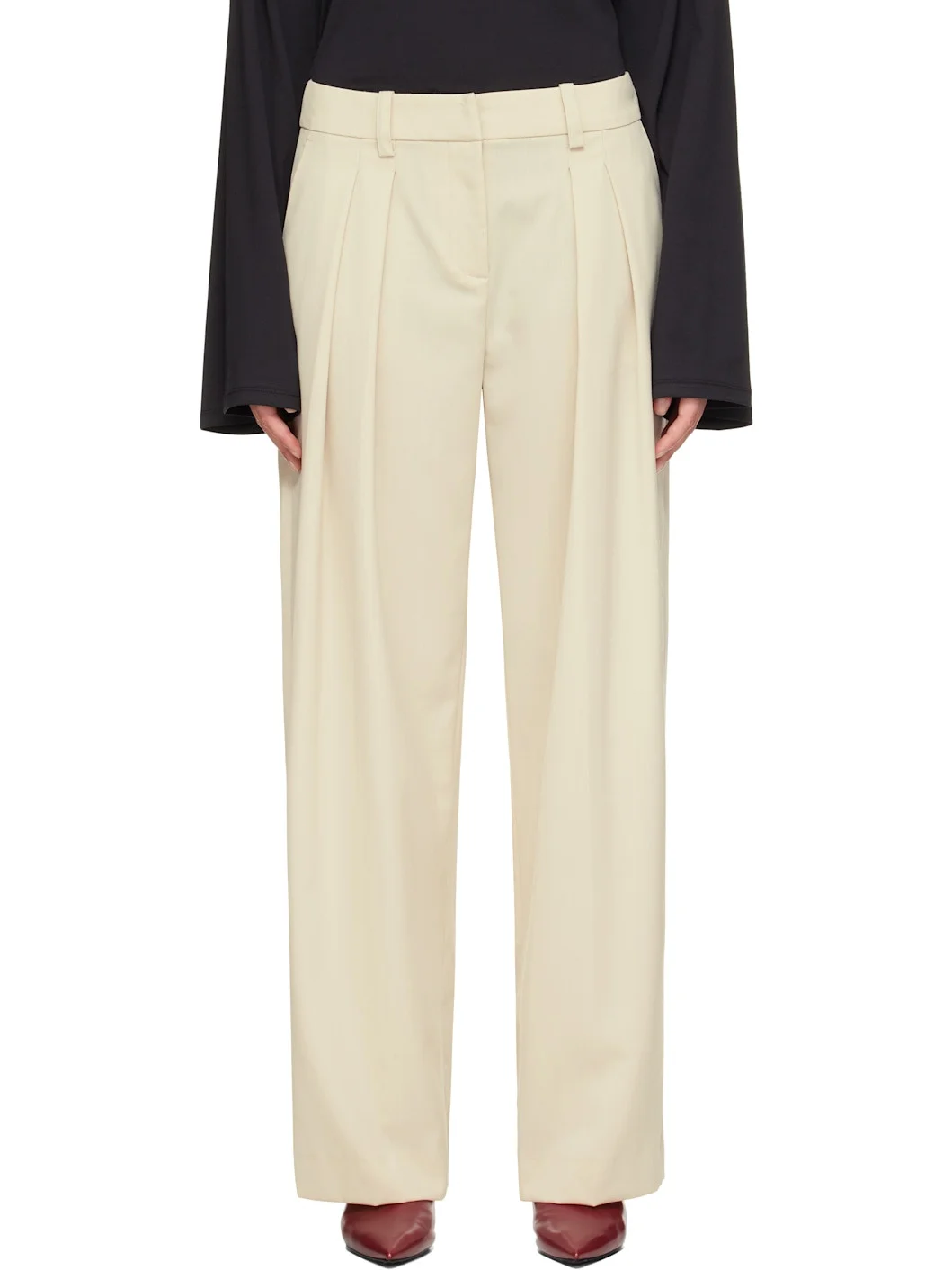 Virgin wool-blend twill trousers. · Wide-leg · High-rise · Belt loops · Three-pocket styling · Zip fly · Pleats at front · Creased legs Supplier color: Cement Body: 55% polyester, 45% virgin wool. Trim: 100% polyester. Made in Serbia 252115F087017