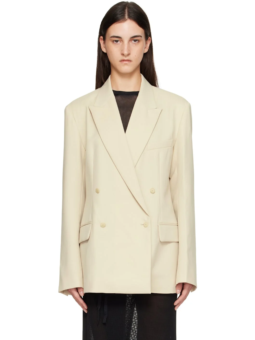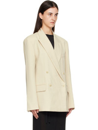 Cotton twill blazer. · Peaked lapel · Double-breasted button closure · Welt pocket at chest · Flap pockets at front · Padded shoulders · Surgeon's cuffs · Welt pocket at interior · Full satin lining Supplier color: Cement Body: 100% cotton. Lining: 100% polyester. Made in Bosnia And Herzegowina 252115F057015
