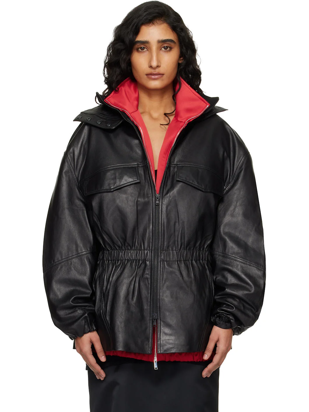 Grained lambskin jacket. · Layered rib-knit stand collar · Two-way zip closure · Flap pockets at chest · Elasticized waist and cuffs · Seam pockets at waist · Peplum hem · Dropped shoulders · Welt pocket at interior · Full satin lining Supplier color: Black Body: 100% leather. Lining: 100% polyester. Made in India 261115F064003