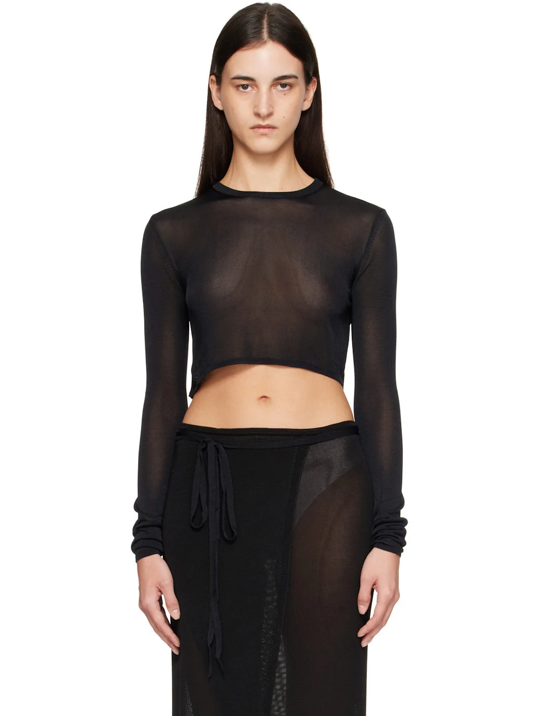 Semi-sheer knit viscose-blend T-shirt. · Crewneck · Cropped hem Supplier color: Black 88% viscose, 12% polyamide. Made in Italy 252115F110009