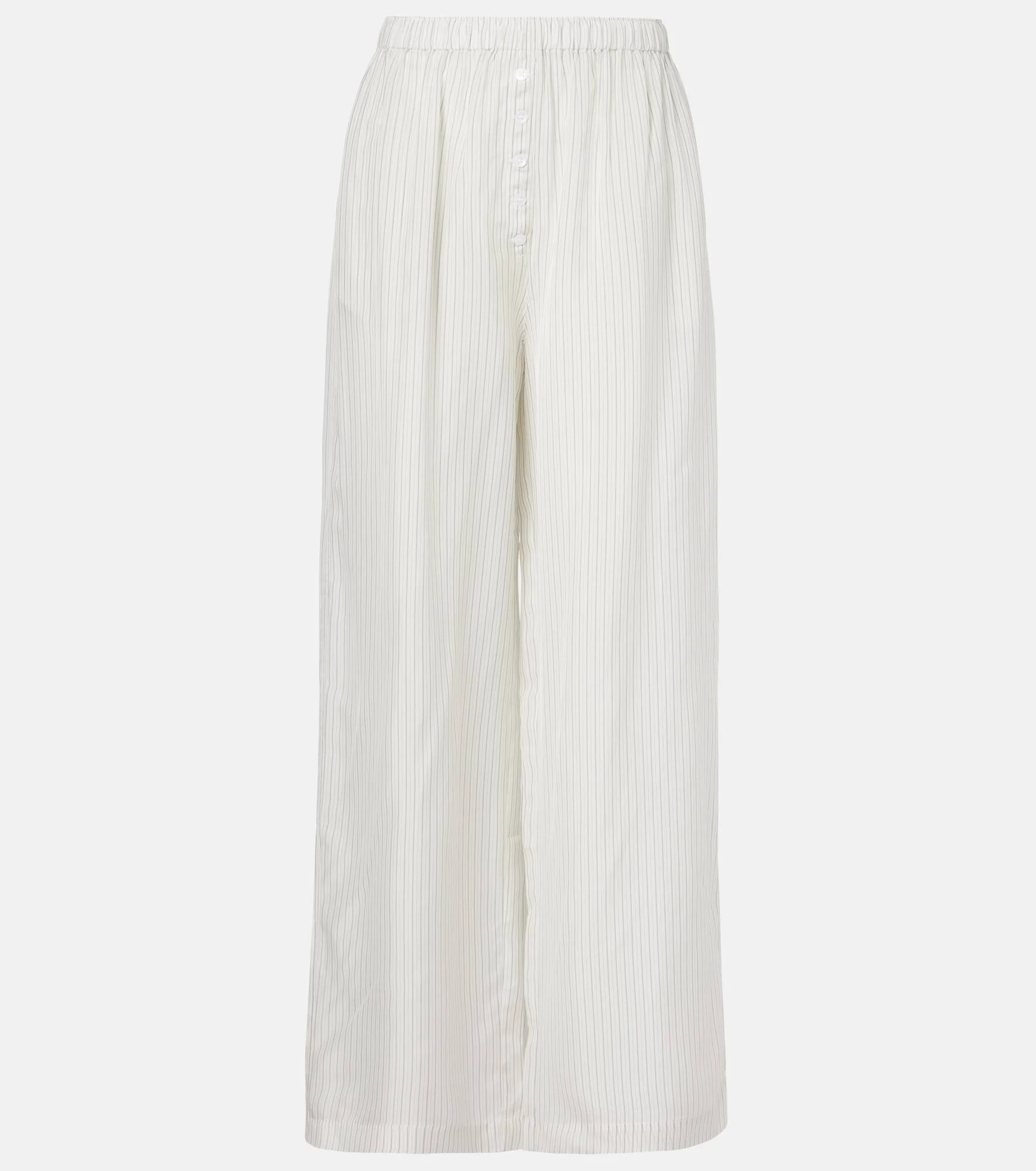 The Brenna wide-leg pants from The Frankie Shop showcase a sheer style with a striped pattern all over. This design is cut to a relaxed silhouette from a lightweight fabric and features side slit pockets. Product Details - Material: 100% cupro - Care instructions: machine wash cold - Made in China - Designer color name: White/Black Stripe - Item color: white - Elasticated waistband - Pockets: side slit pockets - Item number: P01075515 Size & Fit - True to size - Semi-sheer - Elasticated waist - Non-stretchy fabric - Wide-leg - The model seen in the picture is 178cm-5'10" and wearing a size XS
