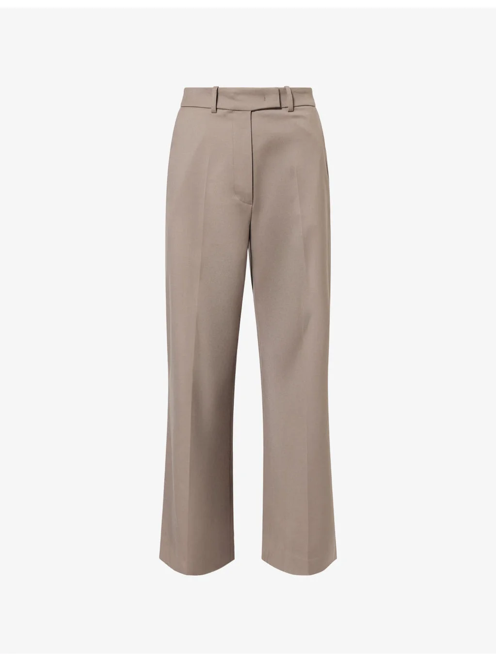 PRODUCT DETAILS - The Frankie Shop woven trousers - 54% polyester, 44% wool, 2% elastane - Button, hook-and-eye and zip-fly fastenings at front - Regular fit, high-rise, wide-leg, belt loops, pressed crease at front and back, side slip pockets, welt pocket at back - Dry clean - True to size - Size small: rise 13.5in / 34cm, inside leg 31.5in / 80cm, leg opening 25in / 64cm - Model is 5ft 10in/1.78m and wears a size small - Midweight, non-stretch Ref: R04547003