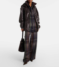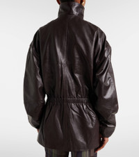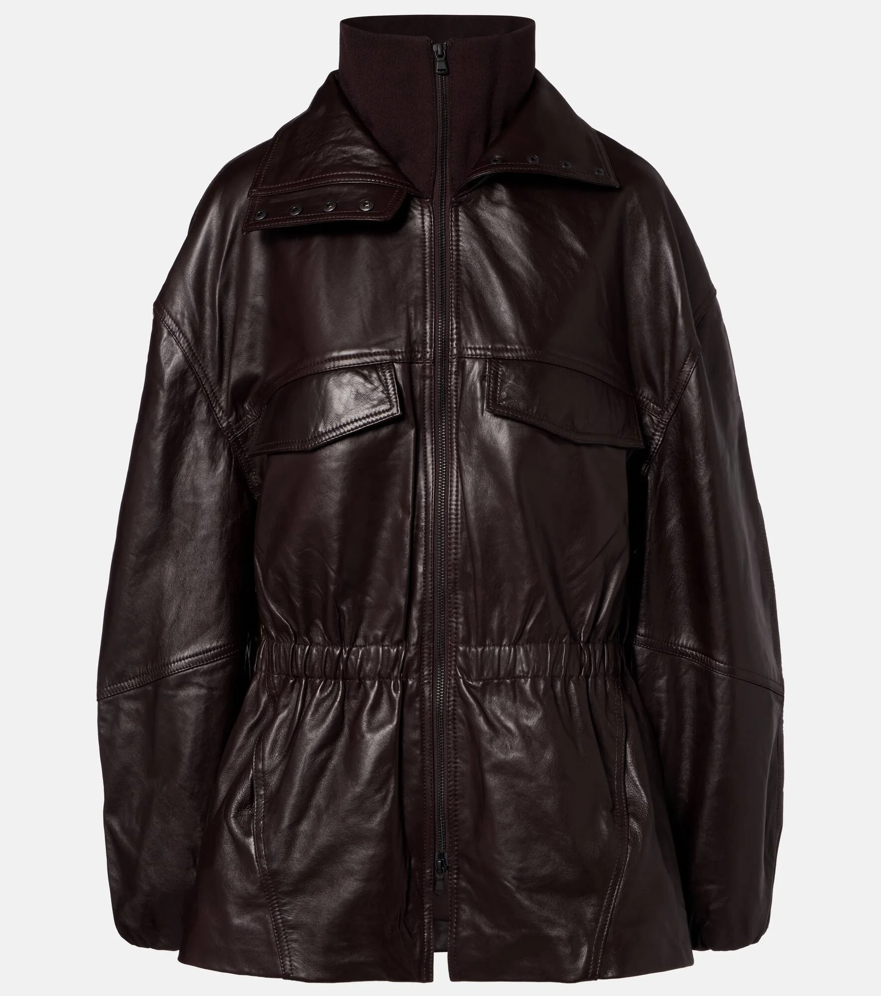 The Frankie Shop has captured the hearts of fashion insiders with their low-effort, high-impact essentials. The Carnaby jacket is made from lamb leather and features an elasticated waist and a double collar for a layered effect. Product Details - Material: 100% leather - Care instructions: dry clean - Made in India - Color: brown - Designer color name: Dark Plum - Lining: 100% polyester - Closure: two-way zipped front with snap-button fastenings - Pockets: snap-buttoned pockets, side slit pockets - Cuff: elasticated - Elasticated waistband - Item number: P01150565 Size & Fit - True to size - Dropped shoulders - Loose fit, elasticated waist - Non-stretchy fabric - Falls below the hip - The model seen in the picture is 178cm-5'10" and wearing a size XS
