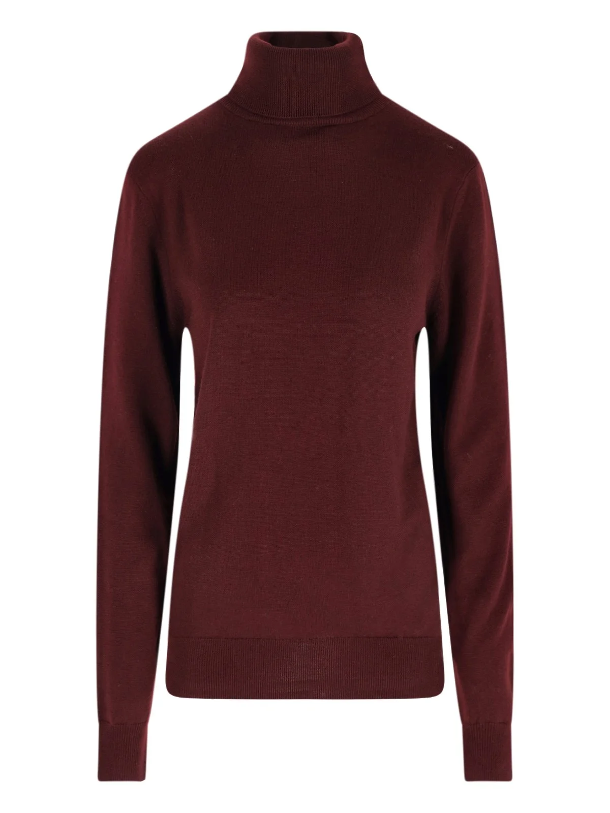 THE FRANKIE SHOP 'DEVAR' SWEATER IN RED MERINO WOOL, BURGUNDY SHADES, HIGH NECK, LONG SLEEVES, RIBBED TRIMS, STRAIGHT HEM. PRODUCT INFO PRODUCT CODE EVE THIN TURTLENECK SWEATERBURGUNDY COMPOSITION: 100% MERINO WOOL SIZE AND FIT: REGULAR FIT MADE IN: CHINA
