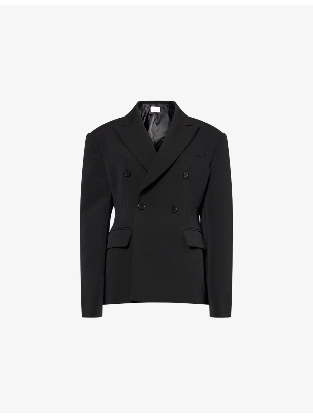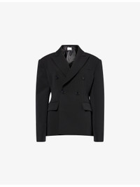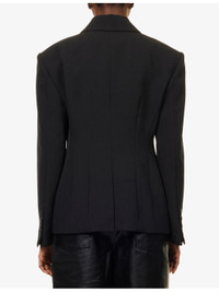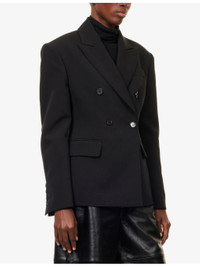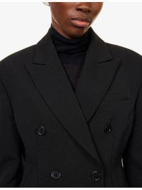 PRODUCT DETAILS - The Frankie Shop woven blazer - 87.5% polyester, 12.5% acetate - Exposed button fastening at front - Relaxed fit, double-breasted, peak lapels, padded shoulders, long sleeves, buttoned cuffs, welt pocket and two flap pockets at front, darts at front and back, cinched waist, fully lined single vent - Machine wash at 30°C - True to size - Size small: length 26in / 66cm - Model is 5ft 10in/1.78m and wears a size small - Midweight, stretchy Ref: R04546982