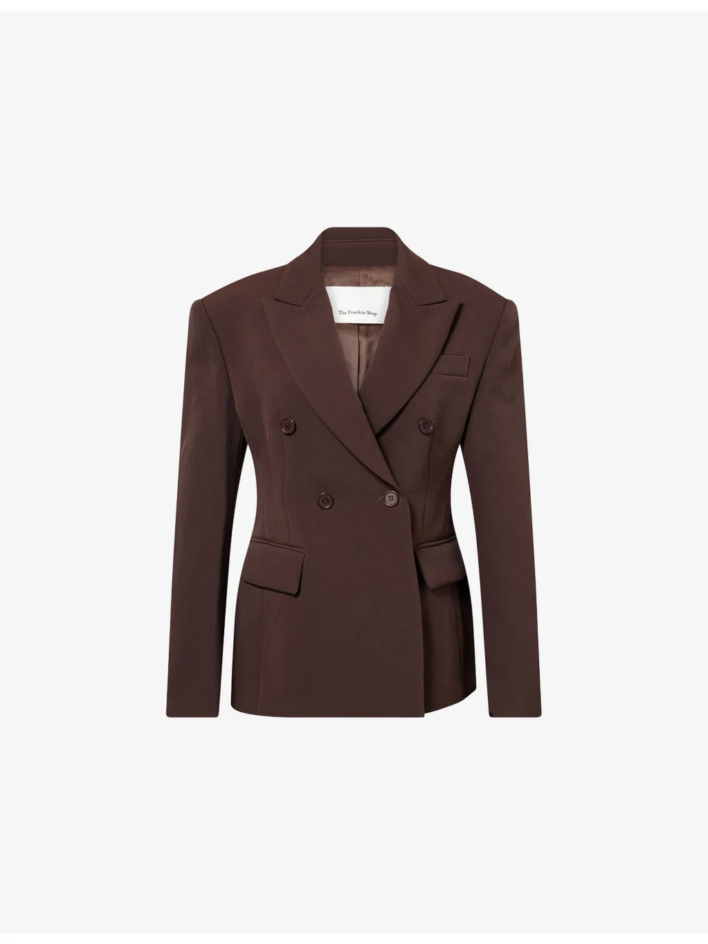 PRODUCT DETAILS - The Frankie Shop woven blazer - 87.5% polyester, 12.5% acetate - Button fastening at front - Regular fit, peak lapels, padded shoulders, long sleeves, buttoned cuffs, welt pocket at chest, flap pockets at front, single vent at back, fully lined - Machine wash cold - Size small: length 26in / 66cm - Model is 5ft 10in/1.78m and wears a size small - Midweight, non-stretch Ref: R04546983