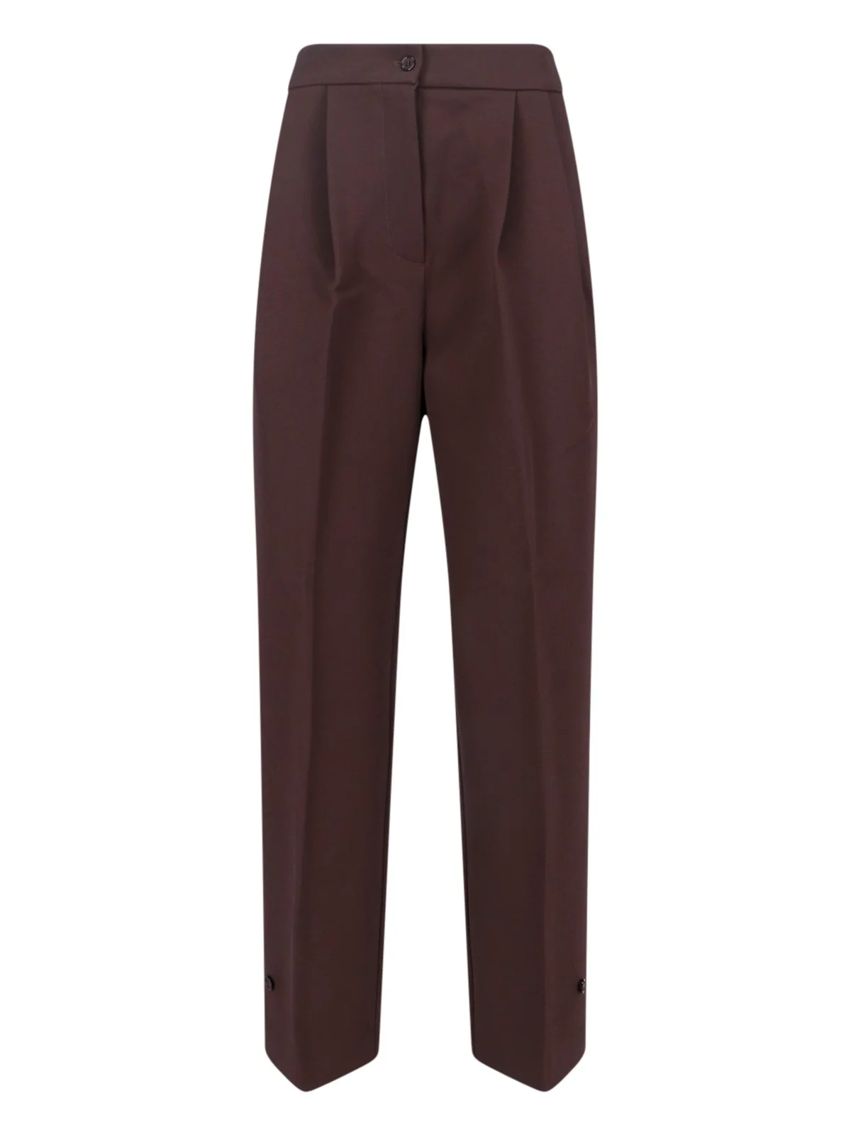 THE FRANKIE SHOP 'DOYER' DARK BROWN FABRIC PANTS WITH ADJUSTABLE BUTTONS AT THE WAIST, BUTTON AND ZIP CLOSURE, FRONT PIN TUCKS, TWO BACK POCKETS, BUTTON DETAIL ON THE LEG, STRAIGHT LEG. PRODUCT INFO PRODUCT CODE DOYER PLEATED TROUSERSBROWN COMPOSITION: 87.5% POLYESTER, 12.5% ACETATE SIZE AND FIT: REGULAR FIT MADE IN: CHINA