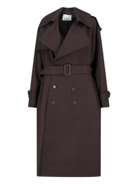 THE FRANKIE SHOP 'DURSLEY' DOUBLE-BREASTED TRENCH COAT IN BROWN VIRGIN WOOL AND FABRIC, SHADES, WIDE CLASSIC LAPELS, DOUBLE-BREASTED BUTTON CLOSURE, ADJUSTABLE AND REMOVABLE BELT, LONG SLEEVES, STRAIGHT HEM. PRODUCT INFO PRODUCT CODE DURSLEY TAILORED TRENCH COATBROWN COMPOSITION: 55% POLYESTER, 45% VIRGIN WOOL SIZE AND FIT: REGULAR FIT MADE IN: BOSNIA AND HERZEGOVINA