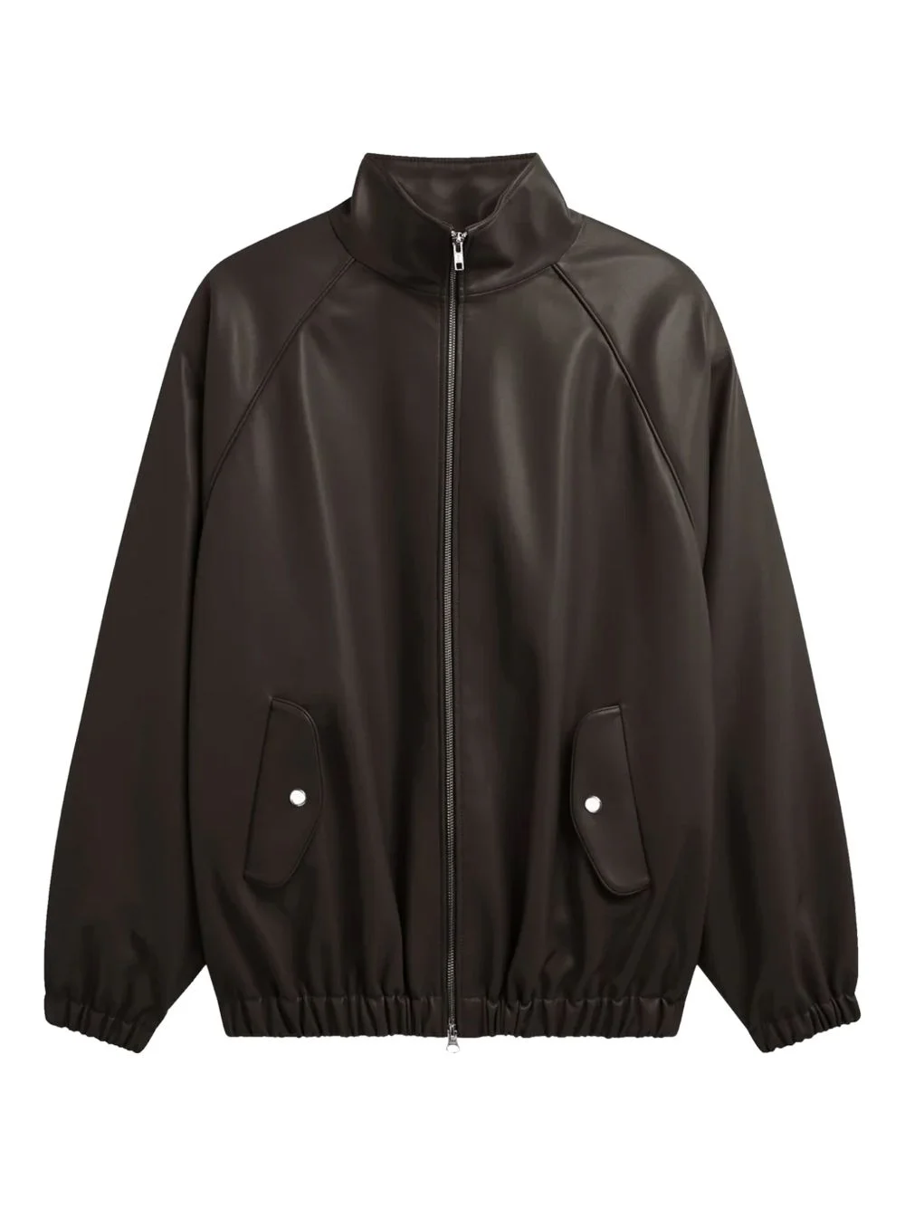 elasticated-trim bomber jacket Highlights - Brown - Faux leather - Two-way zip fastening - Stand-up collar - Puff sleeves - Elasticated trims - Welt pockets Imported Composition Polyurethane 100% Washing instructions Read Manufacturer Guidelines