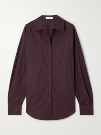 The Frankie Shop's pieces are designed with timeless silhouettes and lasting quality, so you're sure to wear them often. This 'Lui' shirt is cut from 'Dark Plum' organic cotton-poplin for a loose fit and has a rounded hem that's longer at the back. Wear yours with shorts, jeans or tailoring, depending on the occasion. Size & Fit - Intended to be oversized; we recommend sizing down if you prefer a closer fit - Lightweight, non-stretchy fabric - Model is 177cm/ 5'10" and is wearing a size Small Model measurements: - Bust: 80cm/ 31.5" - Waist: 60cm/ 23.5" - Hip: 89cm/ 35" Details & Care - Dark-purple organic cotton-poplin - Button fastenings through front - 100% organic cotton - Green dry clean - Designer color: Dark Plum - Mother-of-pearl: Vietnam