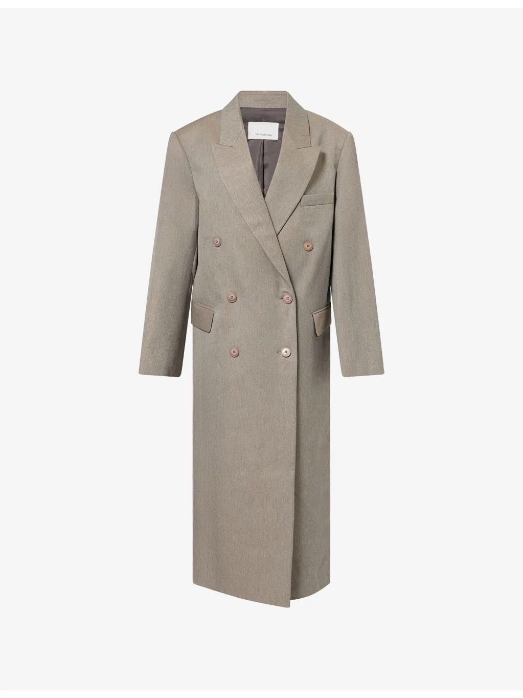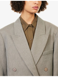 PRODUCT DETAILS - The Frankie Shop woven coat - 66% viscose, 24% polyester, 10% wool - Button fastening at front - Regular fit, peak lapels, padded shoulders, long sleeves, buttoned cuffs, welt pocket at chest, flap pockets at front, single vent at back, fully lined - Dry clean - Made in France - True to size - Size small: length 52.5in / 133.5cm - Model is 5ft 11in/1.80m and wears a size small - Midweight, non-stretch Ref: R04546986