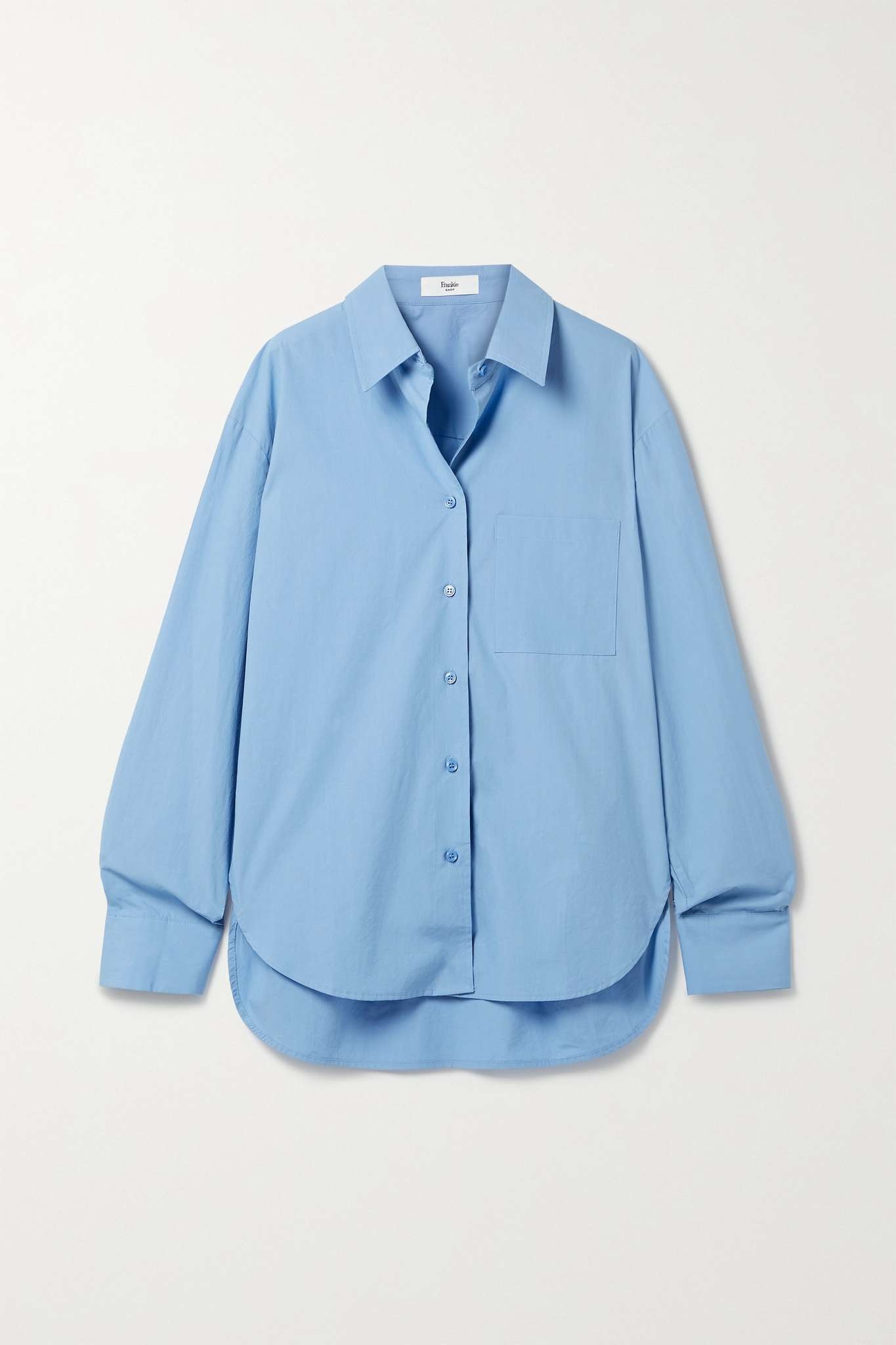EDITORS'NOTES The Frankie Shop's pieces are designed with timeless silhouettes and lasting quality, so you're sure to wear them often. This 'Lui' shirt is cut from vibrant blue organic cotton-poplin for a relaxed fit and has a rounded hem that's longer at the back. Wear yours with the matching shorts, jeans or tailoring, depending on the occasion. SIZE & FIT - Fits true to size, take your normal size - Cut for a relaxed fit - Dropped shoulder seam - Lightweight, non-stretchy fabric - Model is 177cm/ 5'10" and is wearing a size Small DETAILS & CARE - Blue organic cotton-poplin - Button fastenings through front - 100% organic cotton - Machine wash