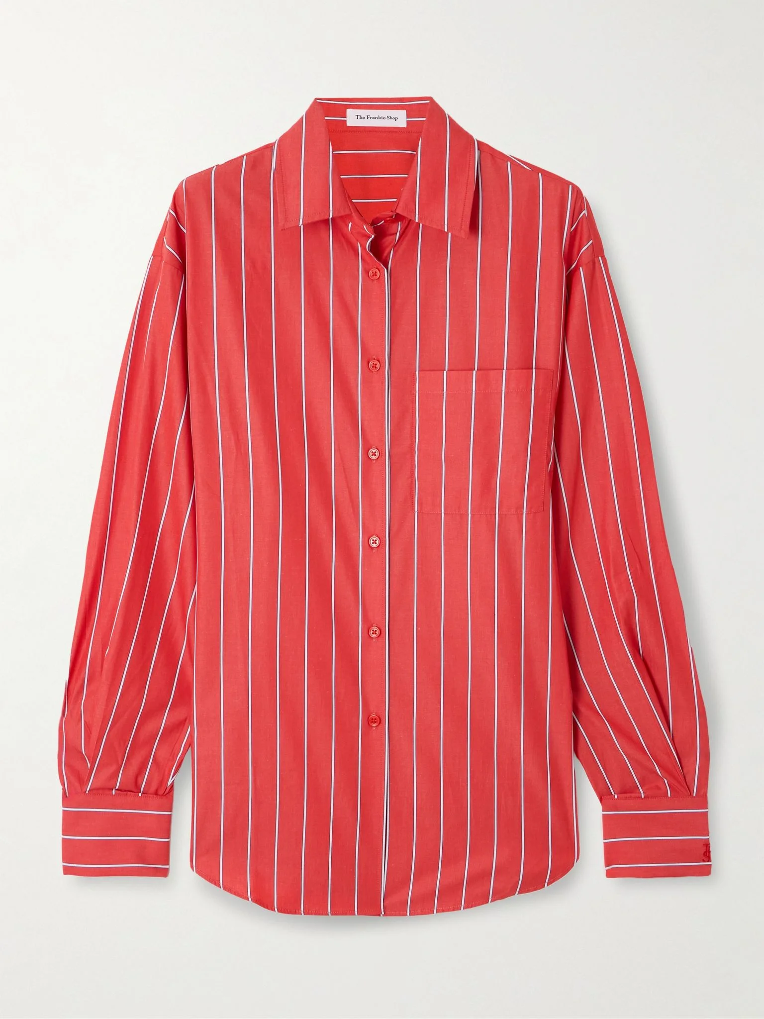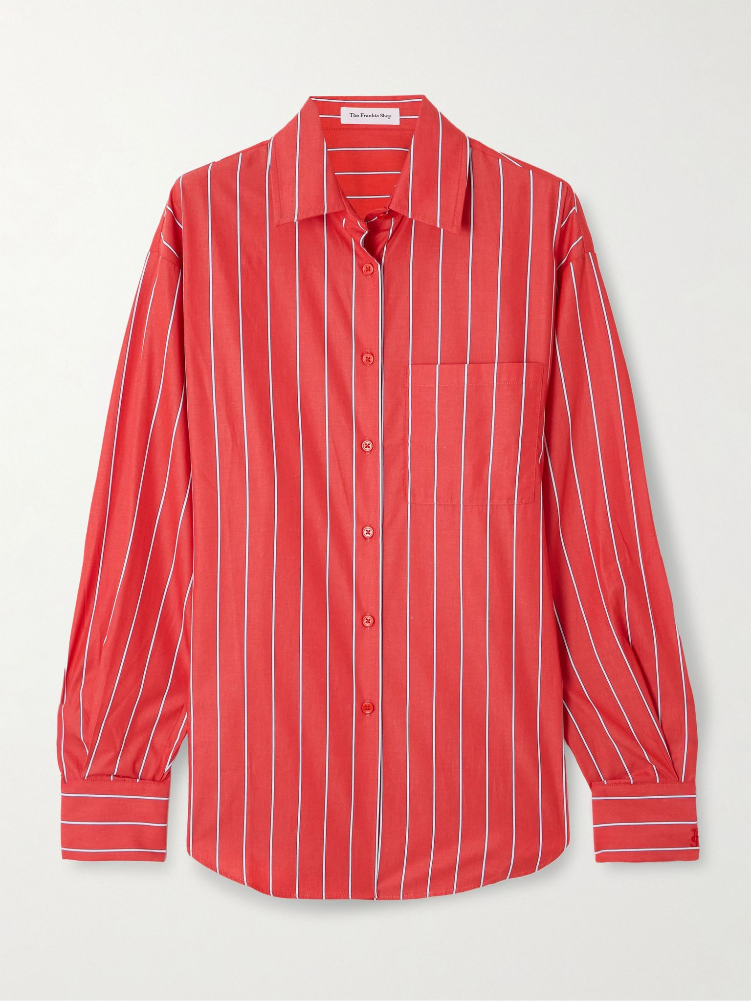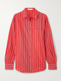 The Frankie Shop's clothes are designed with timeless silhouettes and lasting quality, so you're sure to wear them often. This 'Lui' shirt is cut from striped cotton-poplin for a loose fit and has a rounded hem that's longer at the back. Wear yours with the denim shorts or tailoring, depending on the occasion. Size & Fit - Intended to be oversized; we recommend sizing down if you prefer a closer fit - Lightweight, non-stretchy fabric - Model is 177cm/ 5'10" and is wearing a size Small Model measurements: - Bust: 80cm/ 31.5" - Waist: 60cm/ 23.5" - Hip: 89cm/ 35" Details & Care - Red, white and navy cotton-poplin - Button fastenings through front - 100% cotton - Machine wash