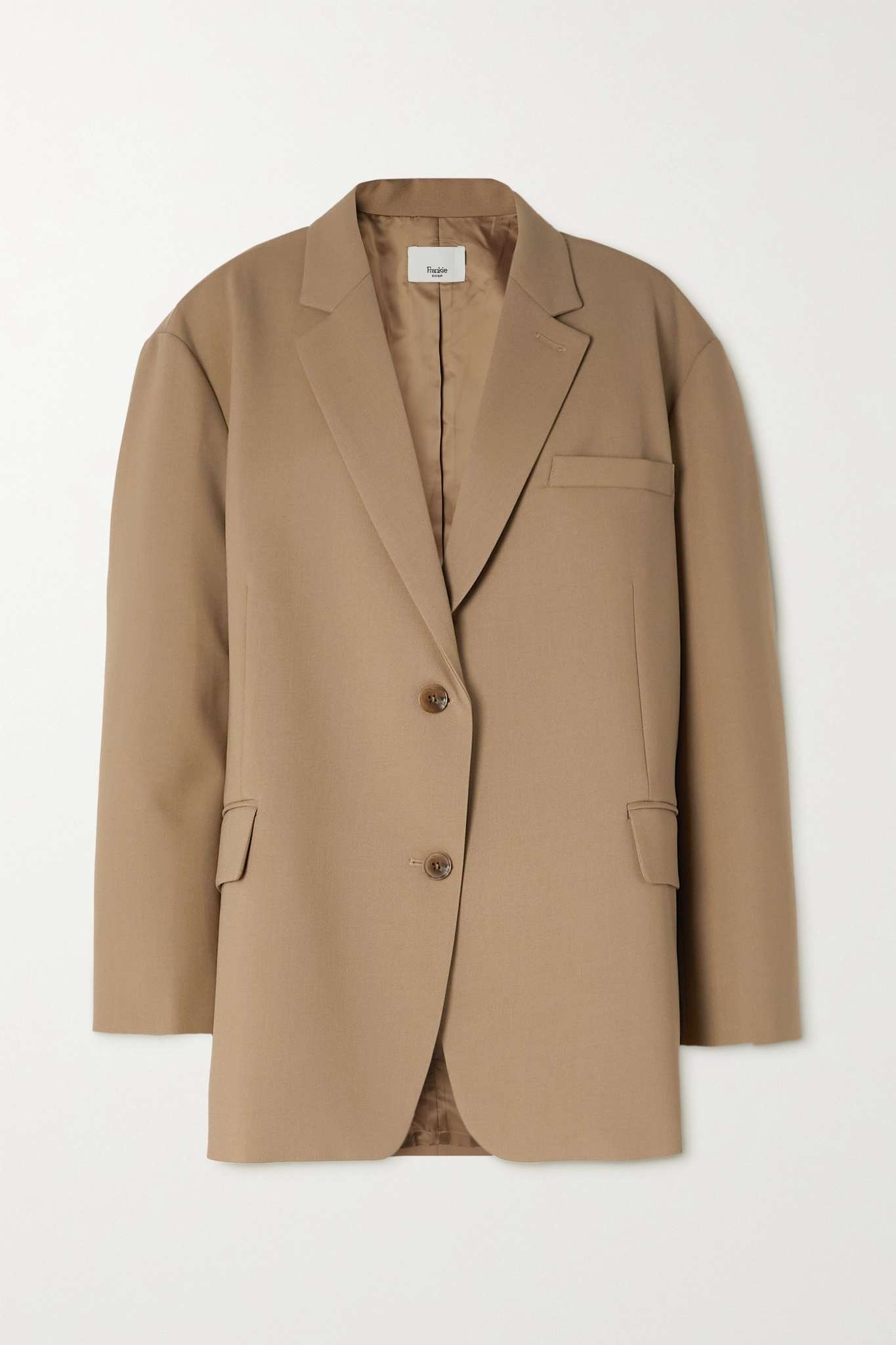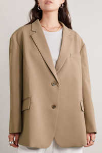 EDITORS'NOTES The Frankie Shop's 'Bea' blazer has a soft, unstructured design with dropped, padding-free shoulders that enhance the boxy silhouette. Tailored from crepe, it's lined in smooth satin for easy layering and has slim notched lapels. Wear yours with the matching pants and underpin it with a bralette or turtleneck sweater. SIZE & FIT - Fits large to size, take one size smaller than normal - Designed for an oversized fit, cut to be worn very loose - Mid-weight, slightly stretchy fabric - Model is 177cm/ 5'10" and is wearing a size XSmall DETAILS & CARE - Sand crepe - Button fastenings through front - 96% polyester, 4% elastane; lining: 100% polyester - Dry clean - Designer color: Latte