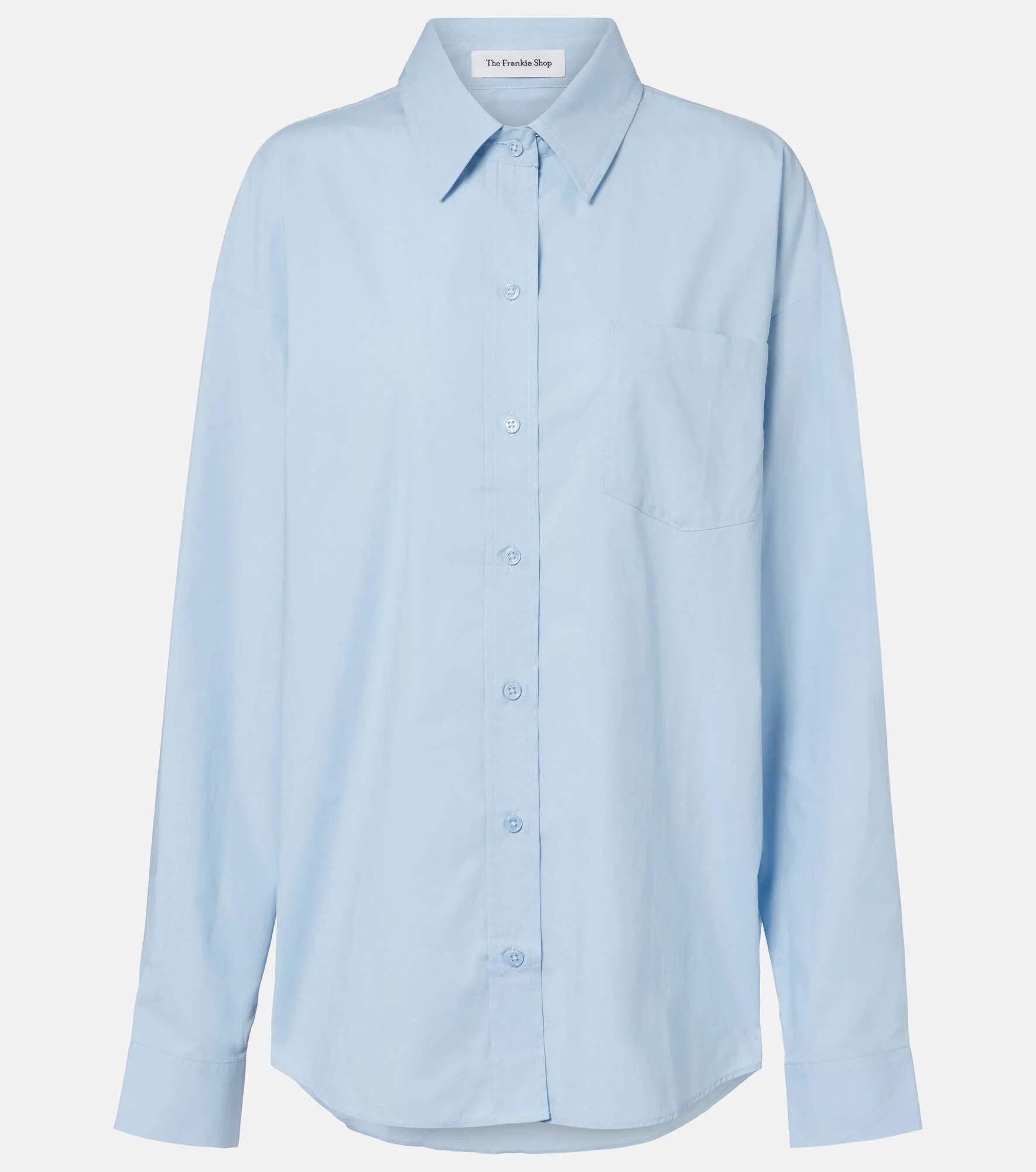 The Frankie Shop has captured the hearts of fashion insiders with their low-effort, high-impact essentials. Defined by an oversized silhouette, the Ornella shirt is crafted from lightweight cotton and features side button fastening for an asymmetric look. Product Details - Material: 100% cotton - Care instructions: machine wash at 30 degrees - Made in Morocco - Designer color name: Light Blue - Item color: blue - Collar: classic (Straight point) - Cuff: buttoned - Pockets: angled chest pocket - Closure: buttoned front - Hem: rounded - Item number: P01097101 Size & Fit - True to size - For a closer fit, we recommend taking one size down - Dropped shoulders - Oversized - Non-stretchy fabric - Falls below the hip - The model seen in the picture is 178cm-5'10" and wearing a size XS