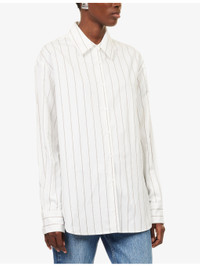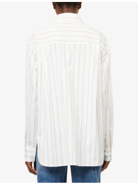 PRODUCT DETAILS - The Frankie Shop woven shirt - 86% viscose, 14% silk - Exposed button fastening at front - Spread collar - Buttoned cuffs - Oversized, collar, long sleeves, straight yoke at back, all-over striped print, split at side, all-over satin texture, curved hem - Machine wash at 30°C - Made in Morocco - True to size - Size small: length 30in / 77cm - Model is 5ft 10in/1.78m and wears a size small - Lightweight, slight stretch Ref: R04546972