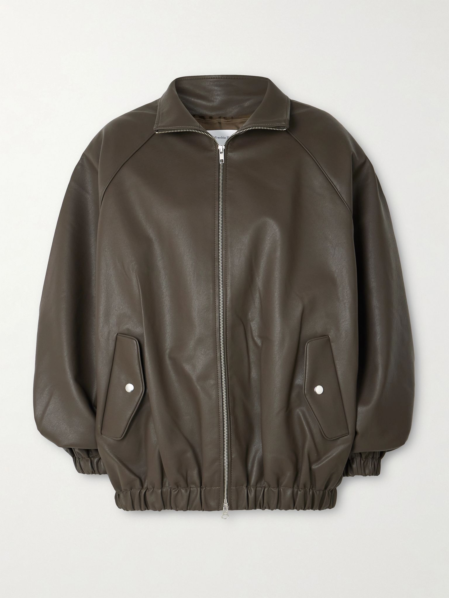 The Frankie Shop's 'Senta' jacket has a roomy, oversized shape that'll layer easily over a chunky knit during the colder months. Made from supple, glossy synthetic material, it has generous raglan sleeves, a stand collar and elasticated trims that temper the shape. Size & Fit - Fits true to size, take your normal size - Designed for an oversized fit, cut to be worn very loose - Mid-weight, non-stretchy fabric - Model is 180cm/ 5'11" and is wearing a size XSmall Model measurements: - Bust: 80cm/ 31.5" - Waist: 65cm/ 25.5" - Hip: 89cm/ 35" Details & Care - Army-green synthetic fabric - Two-way zip fastening through front - 100% polyurethane; lining: 100% polyester - Dry clean - Designer color: Khaki