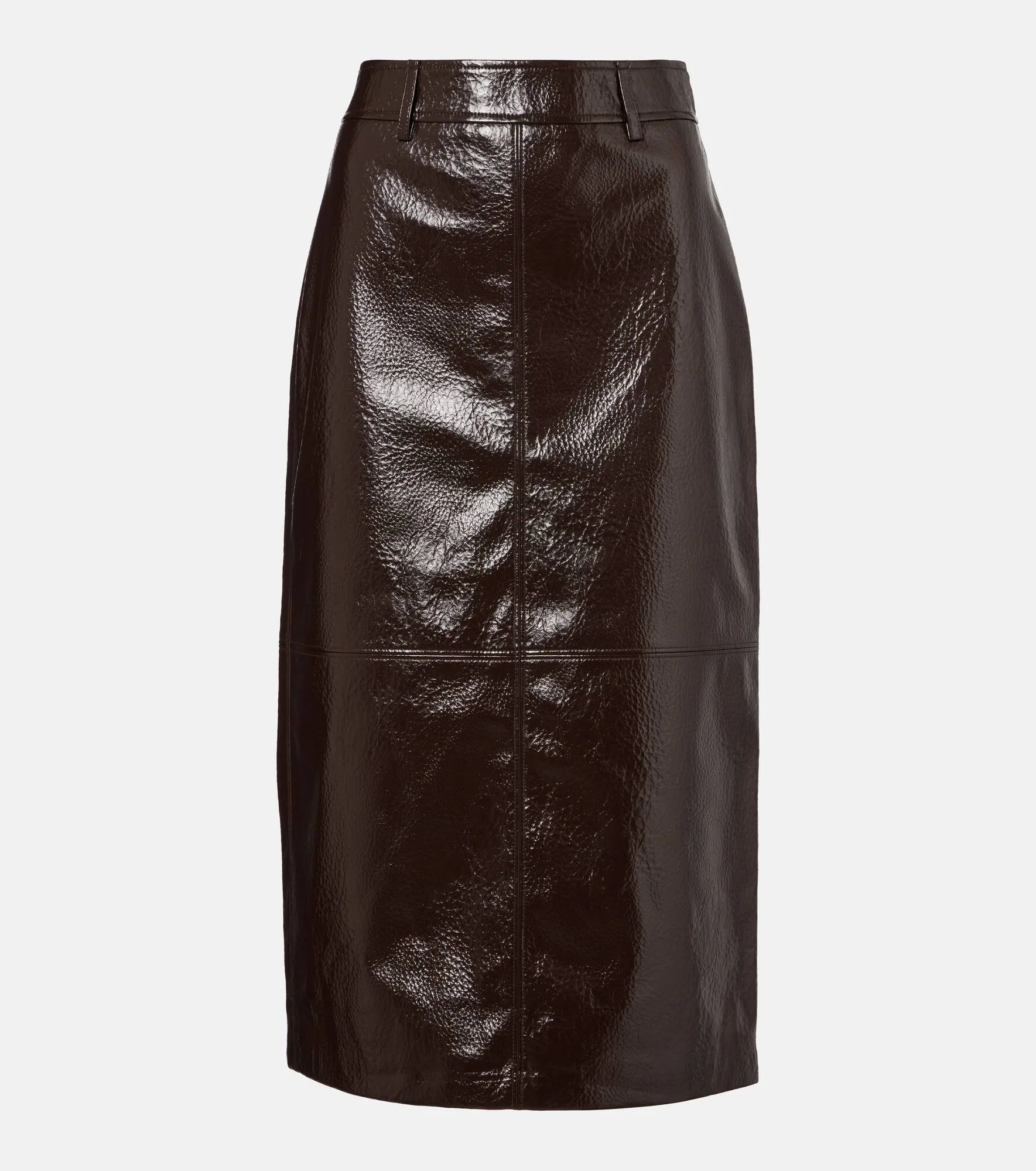 The Frankie Shop has captured the hearts of fashion insiders with high-impact essentials like the Taney pencil skirt. This design is presented in a crinkled finish, complete with paneled detailing and belt loops for a secure fit. Product Details - Material: 100% polyurethane - Care instructions: specialist clean - Made in India - Designer color name: Brown - Item color: brown - Lining: 100% polyester - Closure: concealed zipped back - Belt loops - Short vent - Item number: P01100689 Size & Fit - True to size - Non-stretchy fabric - High-waisted - slit length 29cm-11.5" - The model seen in the picture is 178cm-5'10" and wearing a size XS