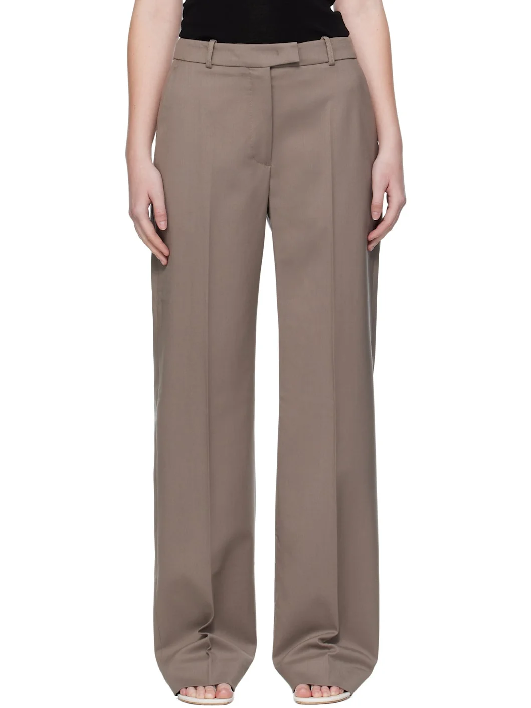 Stretch virgin wool-blend twill trousers. · Straight-leg · High-rise · Three-pocket styling · Zip fly · Creased legs Supplier color: Taupe Body: 54% polyester, 44% virgin wool, 2% elastane. Pocket lining: 100% polyester. Made in Serbia 252115F087006