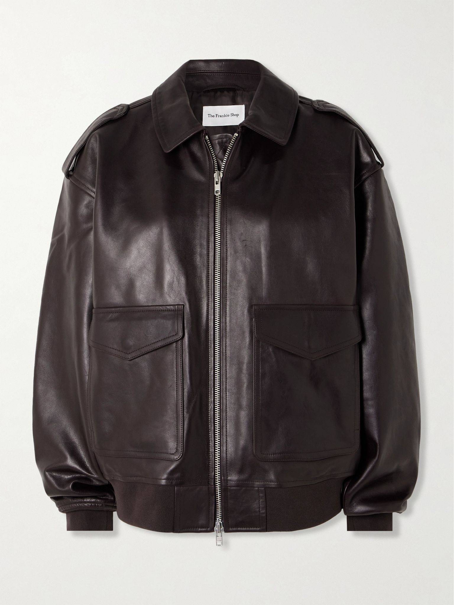 The Frankie Shop's 'Viper' jacket is influenced by bomber, biker and military styles. Cut from supple leather, it has an oversized shape, tempered by ribbed trims and epaulettes on the sloped shoulders. It's framed by a pointed collar and has plenty of pockets for your essentials. Large to size. See Size & Fit notes. Size & Fit - Fits large to size, take one size smaller than normal - Intended for an oversized fit, cut to be worn very loose - Ribbed hem - Supple, non-stretchy leather - Model is 180cm/ 5'11" and is wearing a size XSmall Model measurements: - Bust: 80cm/ 31.5" - Waist: 65cm/ 25.5" - Hip: 89cm/ 35" Details & Care - Dark-purple leather - Two-way zip fastening through front - 100% leather (Cow); lining: 100% polyester - Dry clean - Designer color: Dark Plum