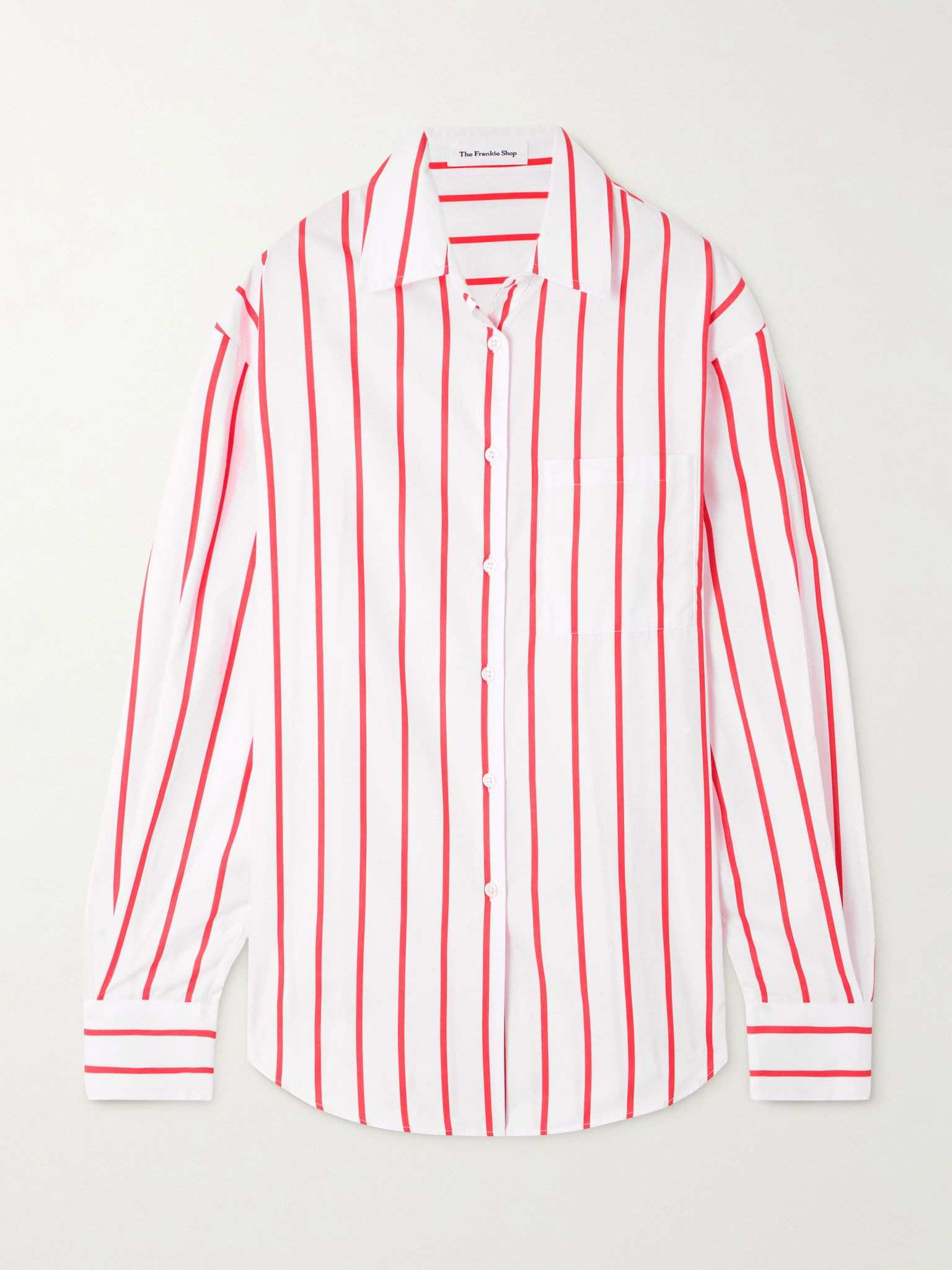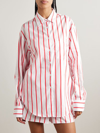 The Frankie Shop's basics are designed with timeless silhouettes and lasting quality, so you're sure to wear them often. This 'Lui' shirt is cut from striped cotton-poplin for an oversized fit and has a rounded hem that's longer at the back. Wear yours with the matching shorts, jeans or tailoring, depending on the occasion. Size & Fit - Intended to be oversized; we recommend sizing down if you prefer a closer fit - Lightweight, non-stretchy fabric - Model is 177cm/ 5'10" and is wearing a size Small Model measurements: - Bust: 80cm/ 31.5" - Waist: 60cm/ 23.5" - Hip: 89cm/ 35" Details & Care - White and red cotton-poplin - Button fastenings through front - 100% cotton - Dry clean - Mother-of-pearl: Vietnam