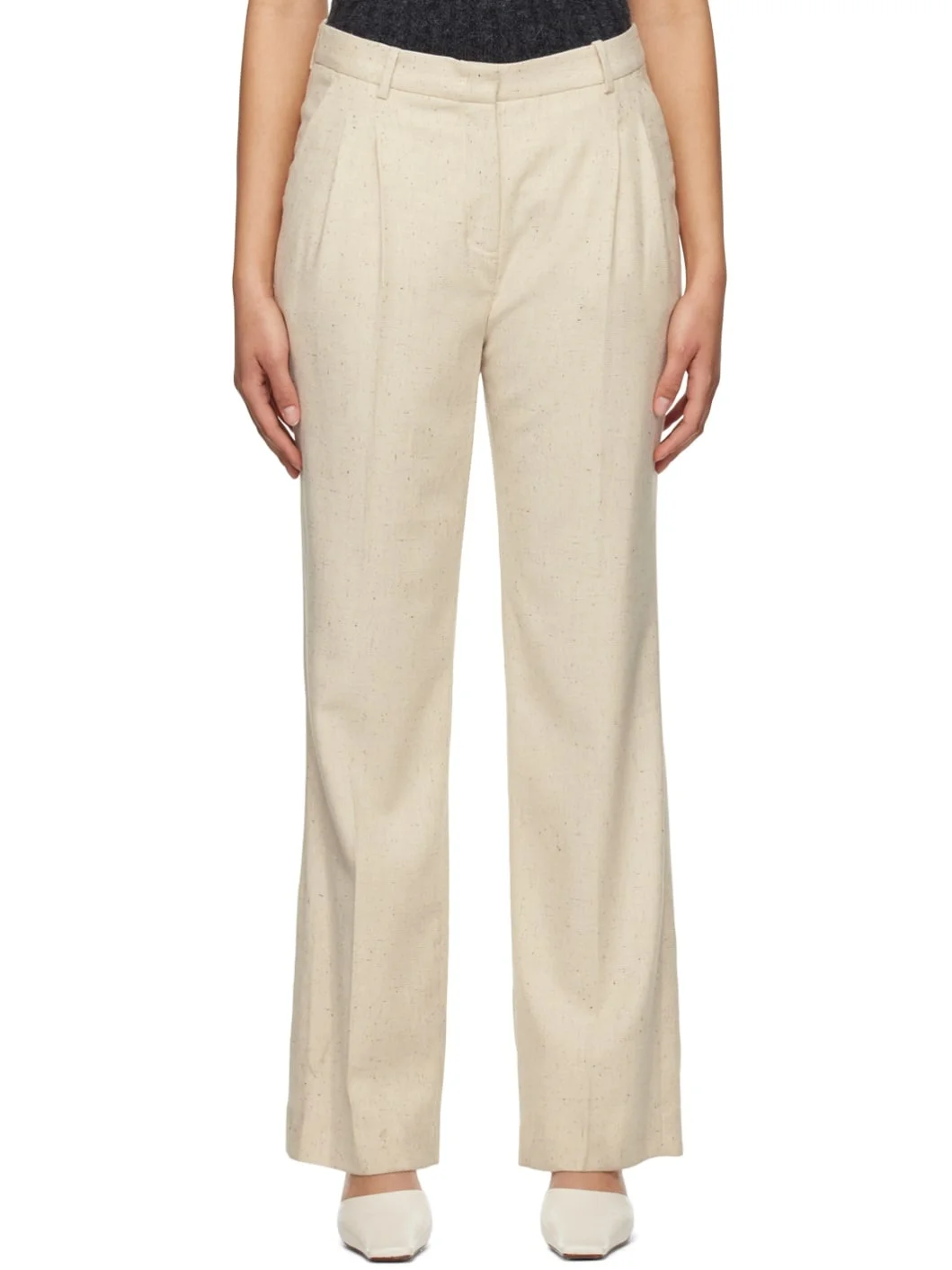 Straight-leg stretch viscose and wool-blend twill trousers. · Belt loops · Three-pocket styling · Zip-fly · Pleats at front waistband · Central crease at front and back legs · Partial plain-woven lining Supplier color: Linen Body: 40% viscose, 28% polyester, 23% wool, 6% polyamide, 2% silk, 1% elastane. Lining: 65% polyester, 35% cotton. Made in Romania 231364F087002