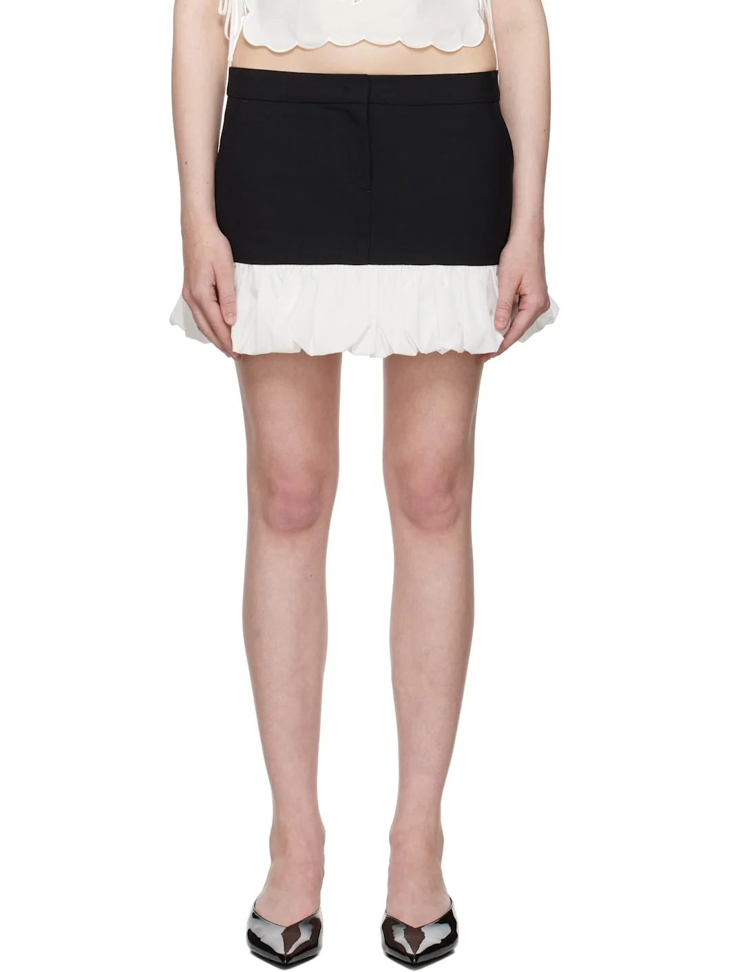 Plain-woven stretch polyester- and wool-blend miniskirt. · Three-pocket styling · Zip fly · Gathering at poplin bubble hem · Partial viscose satin lining Supplier color: Black Body: 53% polyester, 43% wool, 4% elastane. Trim: 65% polyester, 35% cotton. Lining: 100% viscose. Made in Romania 251364F090007