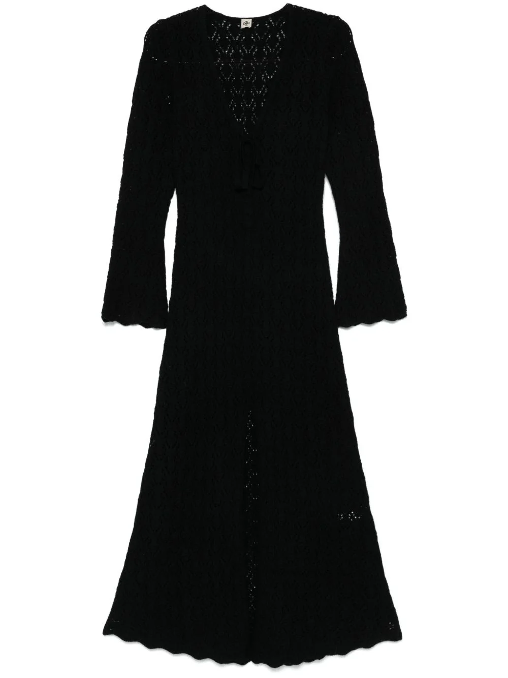 Canada maxi dress Highlights - Black - Wool - Crochet knit - Front lace-up fastening - V-neck - Long sleeves - Flared cuffs - Fitted waistline - Front slit - Unlined - Flared hem - Long length Imported Composition Wool 100% SIZE & FIT Model measurements Height 5 ft 10 in(1.78 m) Bust/Chest 33.46 in(85 cm) Hips 36.22 in(92 cm) Waist 23.22 in(59 cm) FittingInformation Designed for a close fit throughout Made with a midweight knit, this piece offers some stretch