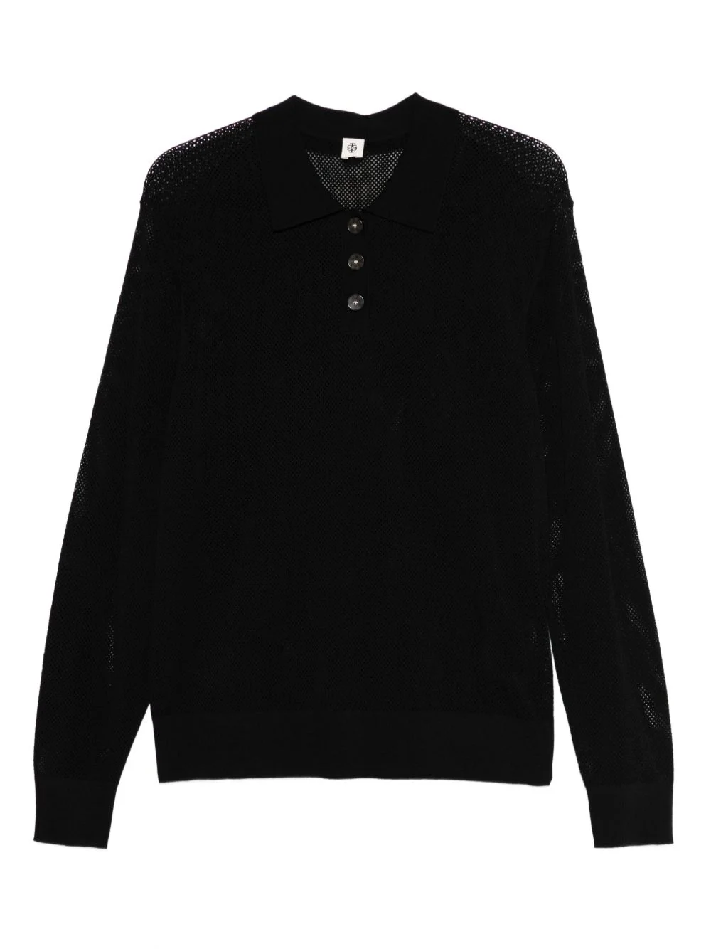 mesh polo top Highlights - Black - Mesh texture - Polo neck - Three button placket - Long sleeves - Straight hem Imported Composition FSC Viscose 83%, Polyester 17% Washing instructions Read Manufacturer Guidelines