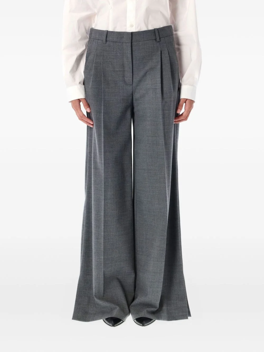 pleated trousers Highlights - Grey - Pleated front - High waist - Button fly - Side pockets Imported Composition Polyester 53%, Wool 43%, Elastane 4% Washing instructions Read Manufacturer Guidelines