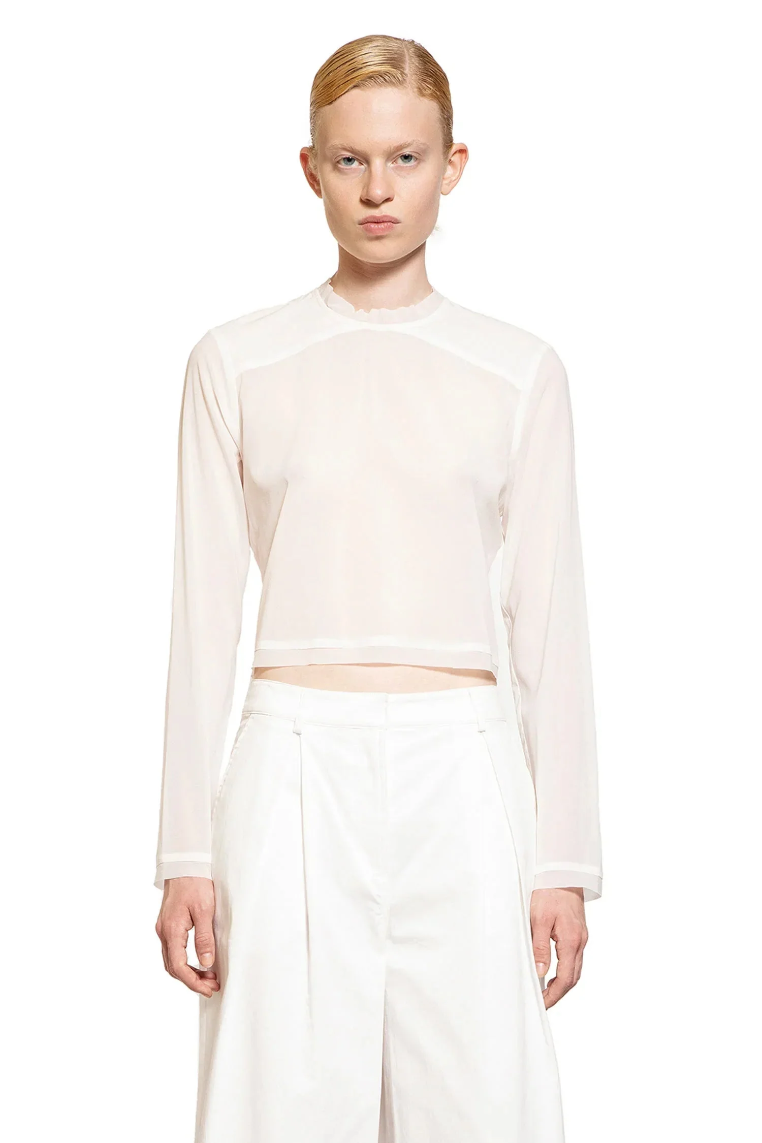 DESCRIPTION - White - Frilled round neck - Semi-sheer stretch silk chiffon - Dropped shoulders - Long sleeves - Back teardrop button closure - Cropped hem - Boxy fit DETAILS - Made in: China - Composition: 88% Silk 12% Elastane - Model code: 21098 000 - Item ID: 9273589268822