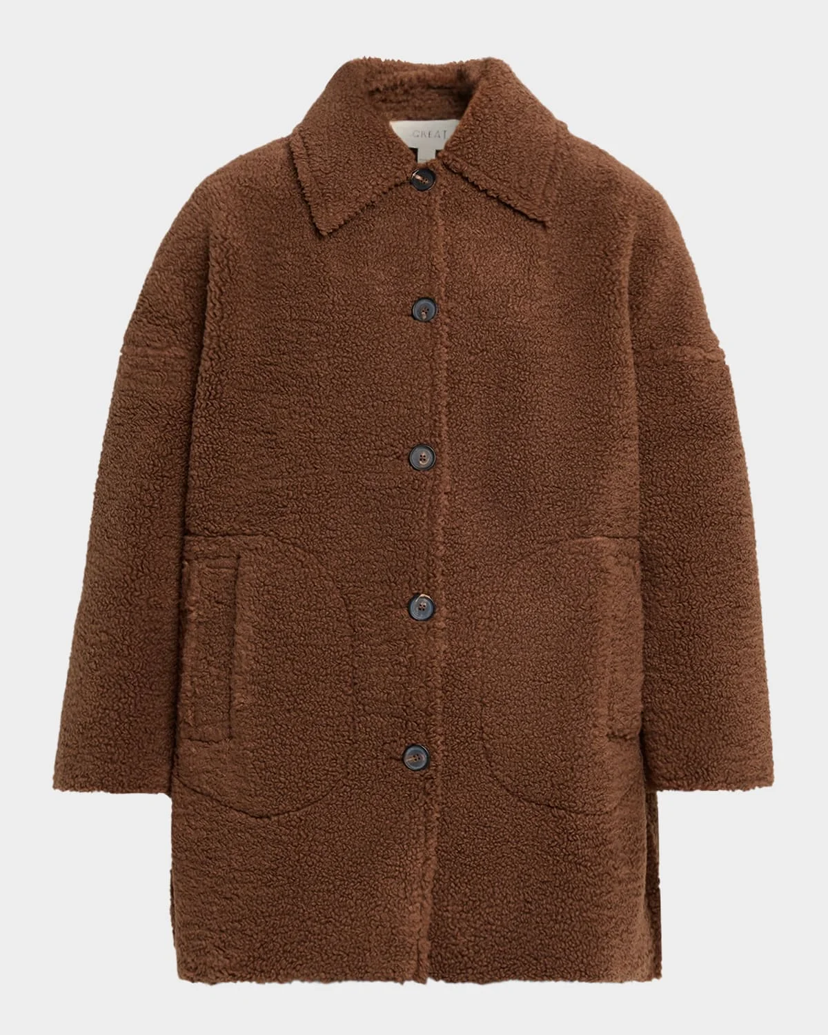 The Great car coat crafted from a plush teddy sherpa (polyester) Spread collar Dropped shoulders Long sleeves Side pockets Relaxed, boxy fit Hem falls to the hip Buttonfront Polyester Dry clean Imported