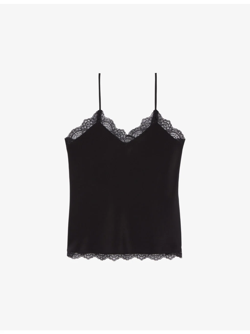 PRODUCT DETAILS - The Kooples silk top - 100% silk - Slips on - Relaxed fit, lace embroidery at the neckline, spaghetti straps - Hand wash - True to size - Model is 5ft 10in/1.78m and wears a size UK 8 - Lightweight, non-stretch Ref: R04352767