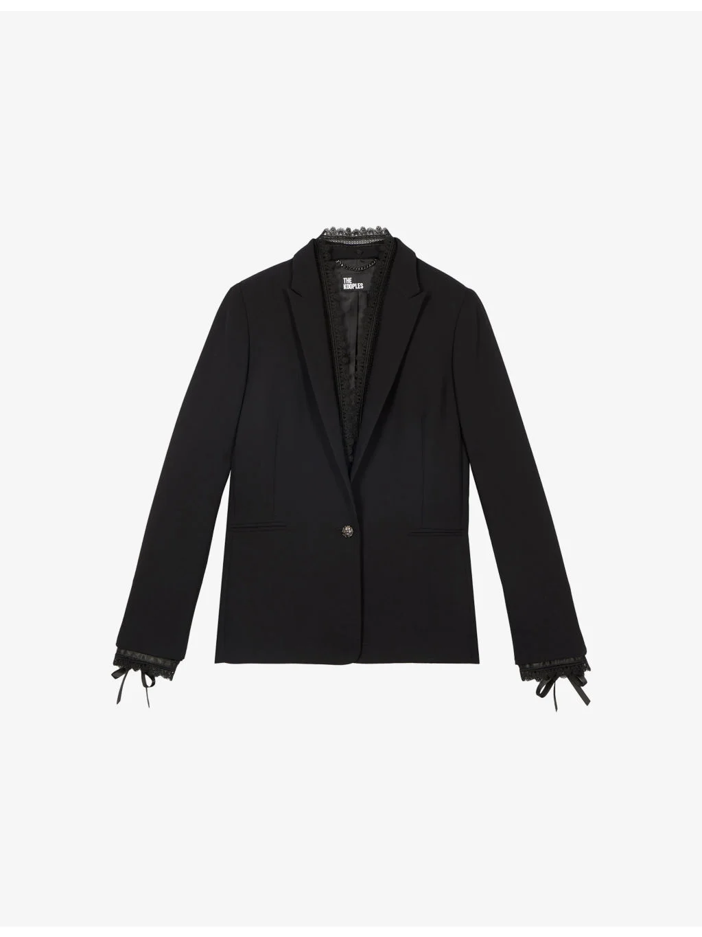 PRODUCT DETAILS - The Kooples woven blazer - 100% polyester - Button fastening - Regular fit, peak lapels, single-breasted, long sleeves, buttoned cuffs, side pockets, lace trim - Dry clean - True to size - Model is 5ft 10in/1.78m and wears a size UK 8 - Midweight, non-stretch Ref: R04584776