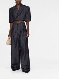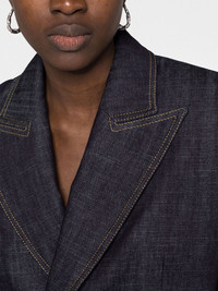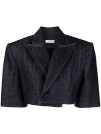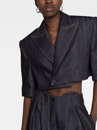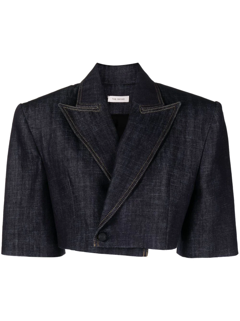 Aspos denim cropped blazer The Mannei reimagines and reconstructs classic trends, and this Aspos blazer is the perfect example of that. It's cut from rigid cotton denim in a boxy fit and embellished with yellow contrast stitching. Highlights - Navy blue - Cotton - Contrast stitching - Peak lapels - Short sleeves - Front button fastening - Straight hem - Cropped Imported Composition Outer: Cotton 100% Lining: Viscose 100% SIZE & FIT Model measurements Height 5 ft 11 in(1.8 m) Bust/Chest 32.67 in(83 cm) Hips 36.22 in(92 cm) Waist 24.4 in(62 cm) FittingInformation Designed for a boxy fit, intended for a loose fit throughout The internal shoulder pads offer a structured shape Made from a midweight non-stretch fabric This piece fits true to size – take your usual size