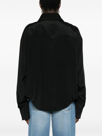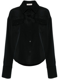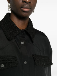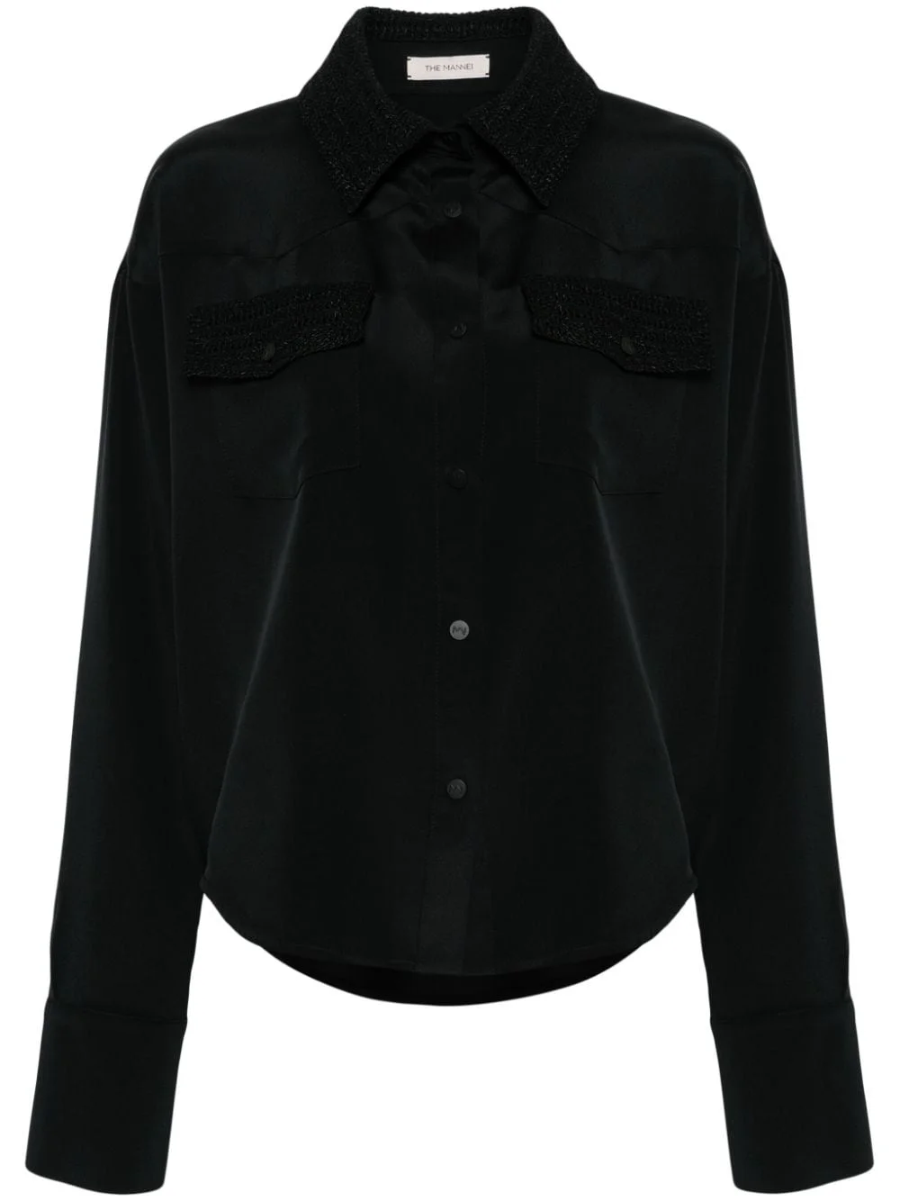 Toledo crochet knit-detail shirt Highlights - Black - Stretch-silk - Crochet knit details - Classic collar - Drop shoulder - Long sleeves - Press-stud fastening cuffs - Two chest flap pockets - High-low curved hem - Front press-stud fastening Imported Composition Silk 93%, Cotton 80%, Viscose 20%, Elastane 7% SIZE & FIT Model measurements Height 5 ft 10 in(1.77 m) Bust/Chest 32.28 in(82 cm) Hips 35.03 in(89 cm) Waist 25.19 in(64 cm) FittingInformation Designed to be unstructured, offering a loose fit throughout Made from a midweight stretch fabric, this piece offers elasticity and flexibility when worn This piece fits true to size – take your usual size