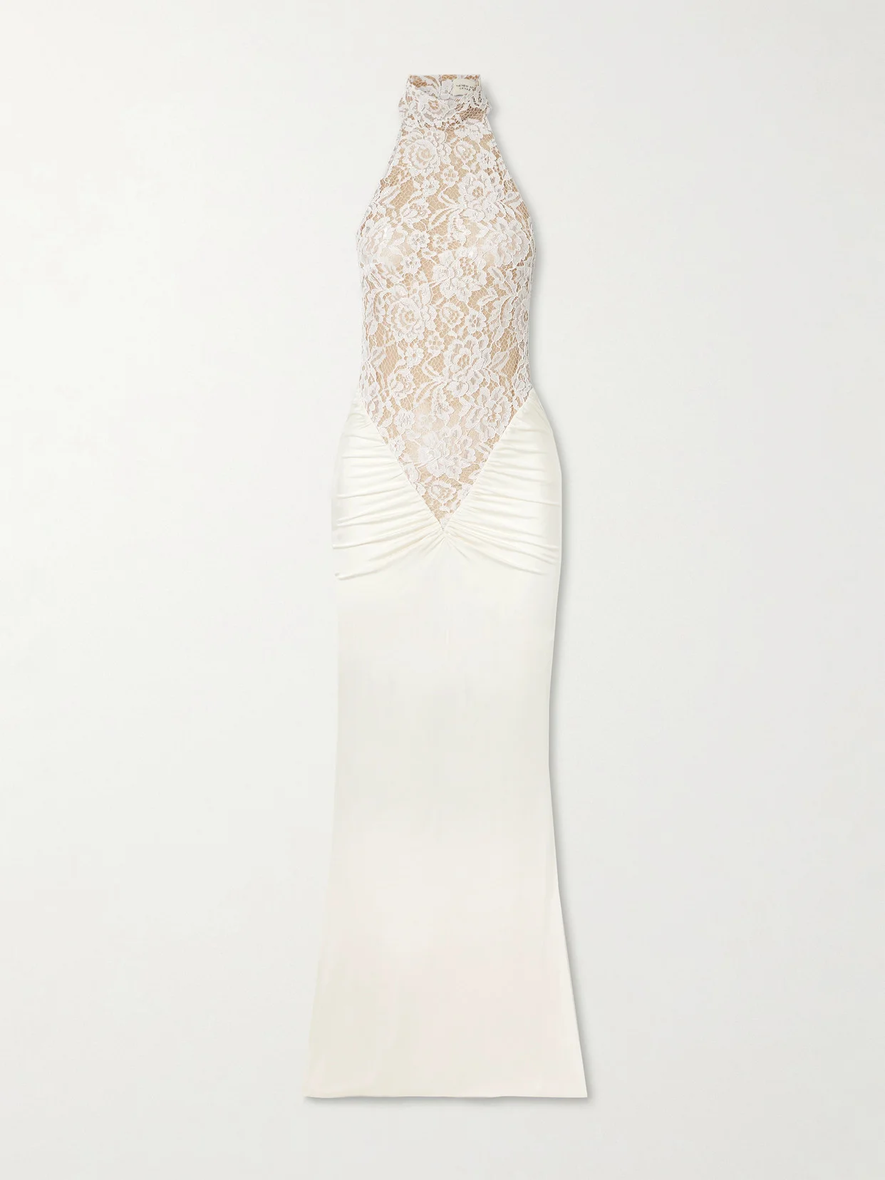 Cass Gathered Lace-trimmed Satin-jersey Halterneck Gown