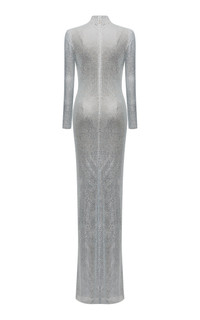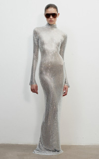 PRODUCT DETAILS - Slim fit, long sleeves, turtleneck - Zipper fastening on back - Composition: 100% Polyester - Color: Silver - Dry Clean Only - Pre Fall '25