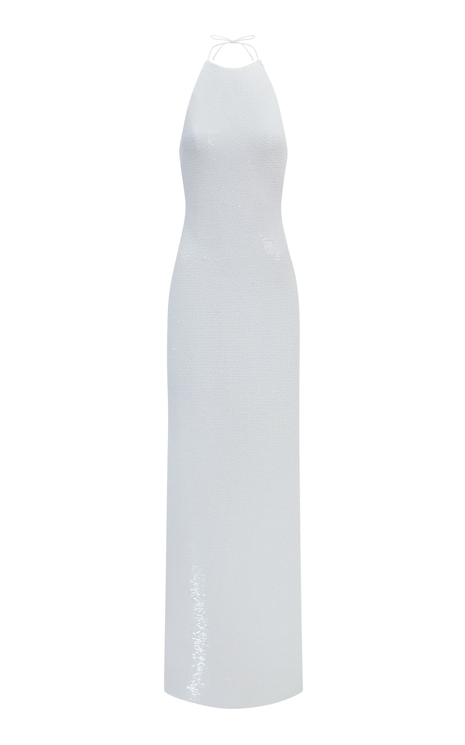 Turkish cool girl İlkyaz Ozel returns with more scintillating party pieces to love. True to form, this season radiates a hedonistic edge across her high-shine signatures that capture a retro glamour. The 'Cindy' gown is fully embroidered with tonal white sequins. Finished with an open back and halter neck sequined with delicate straps. PRODUCT DETAILS - Pre Fall '25 - Self tie and zip fastening on back - Composition: 100% Polyester - Dry clean only - Made in Turkey SIZE & FIT - Our model is wearing a size FR 34 - Model is 5'10" with a 31" bust, 23.5" waist, and 33.5" hip